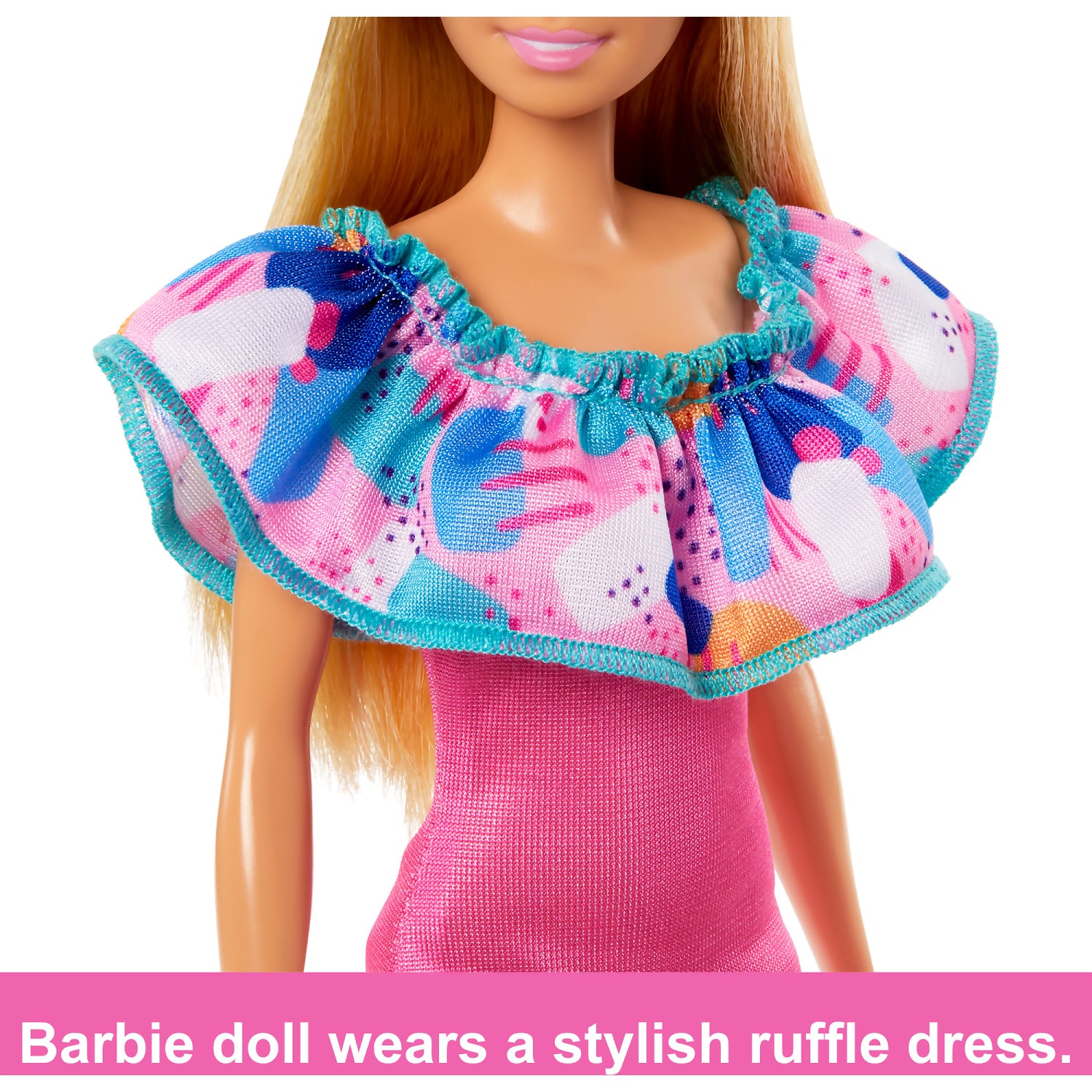 - Always fabulous, big sis Barbie doll wears an off-the-shoulder, ruffle-collar dress and sneakers.