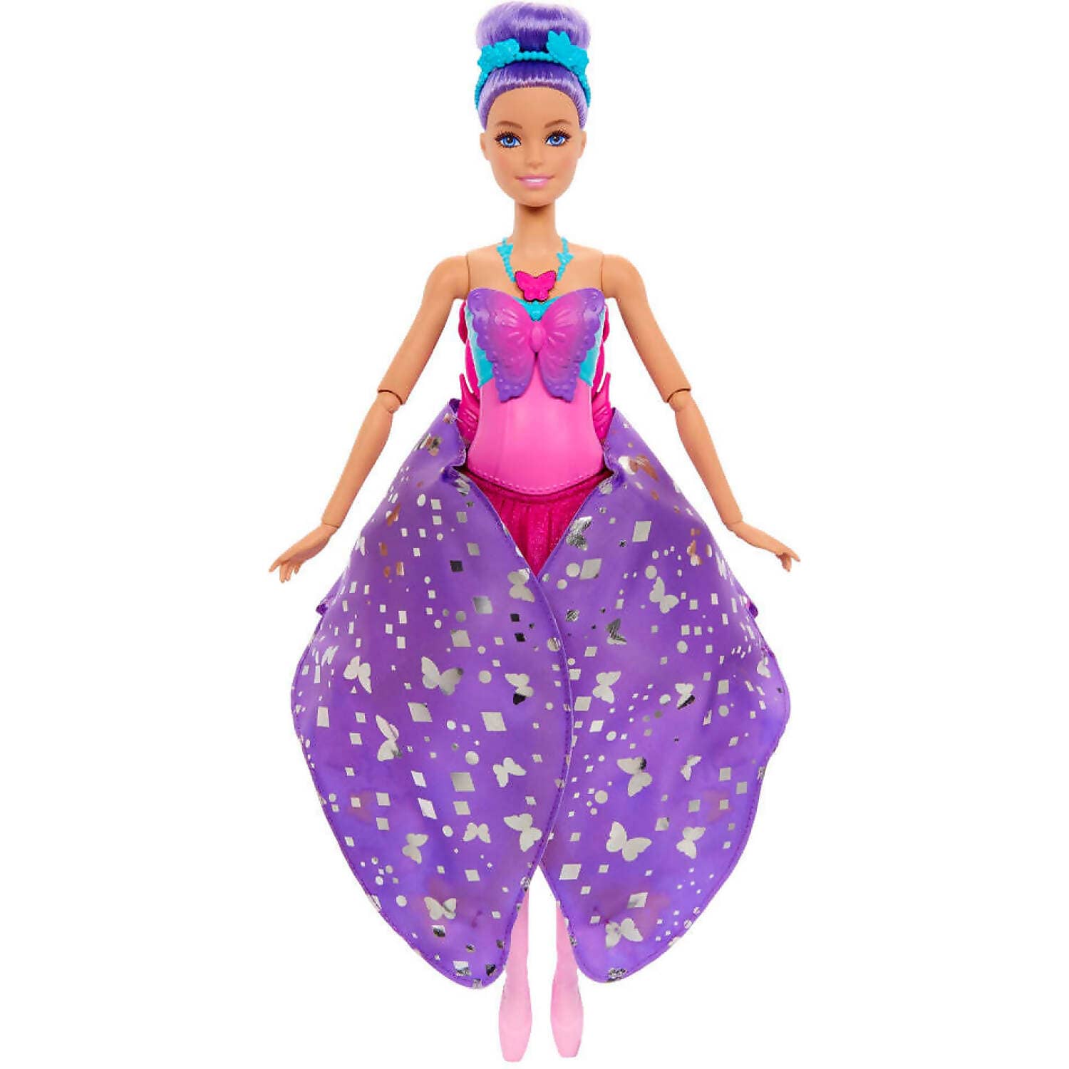 Inspire imaginations to fly with Barbie Dance and Flutter doll and a 2-in-1 magical transformation! Simply press the necklace on the doll's bodice and watch her purple overskirt unfurl like magic into large shimmering butterfly wings. It's a wow moment that kids will love activating again and again.