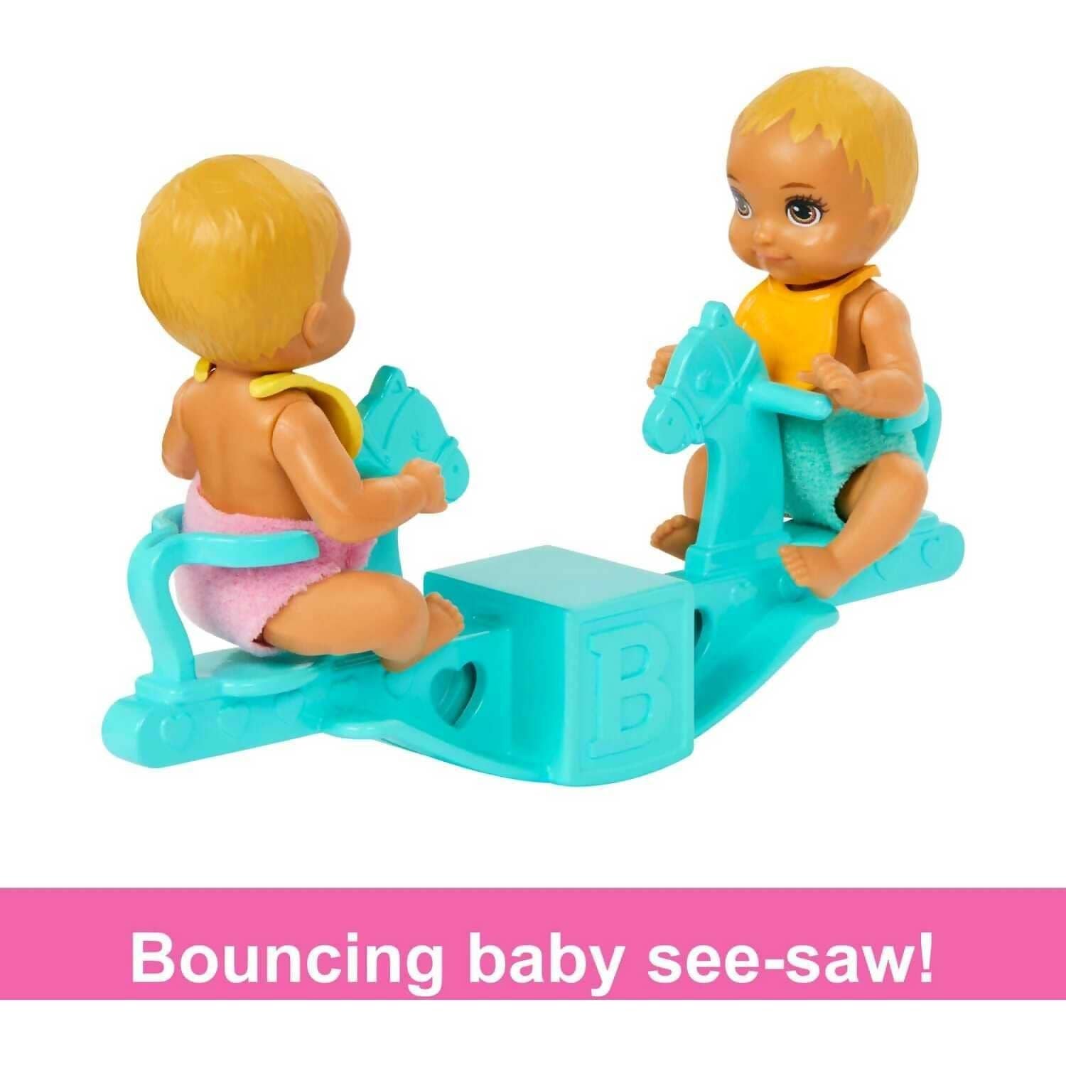 It's double the fun and cuteness with this Barbie twinning nursery playset! Skipper the teenage sister of Barbie has two of everything to babysit the twin dolls, both wearing removable diapers. There's a crib for two that really rocks, a rainbow swing with a seat for the twins, a bouncing baby see-saw, and a play arch that can fit on the crib or used on the ground. With additional accessories like bottles, blankets, bibs, toy trains, and teddy bears, Skipper has everything she needs to take care of the adorable twins! Doll cannot stand alone. Colors and decorations may vary.
