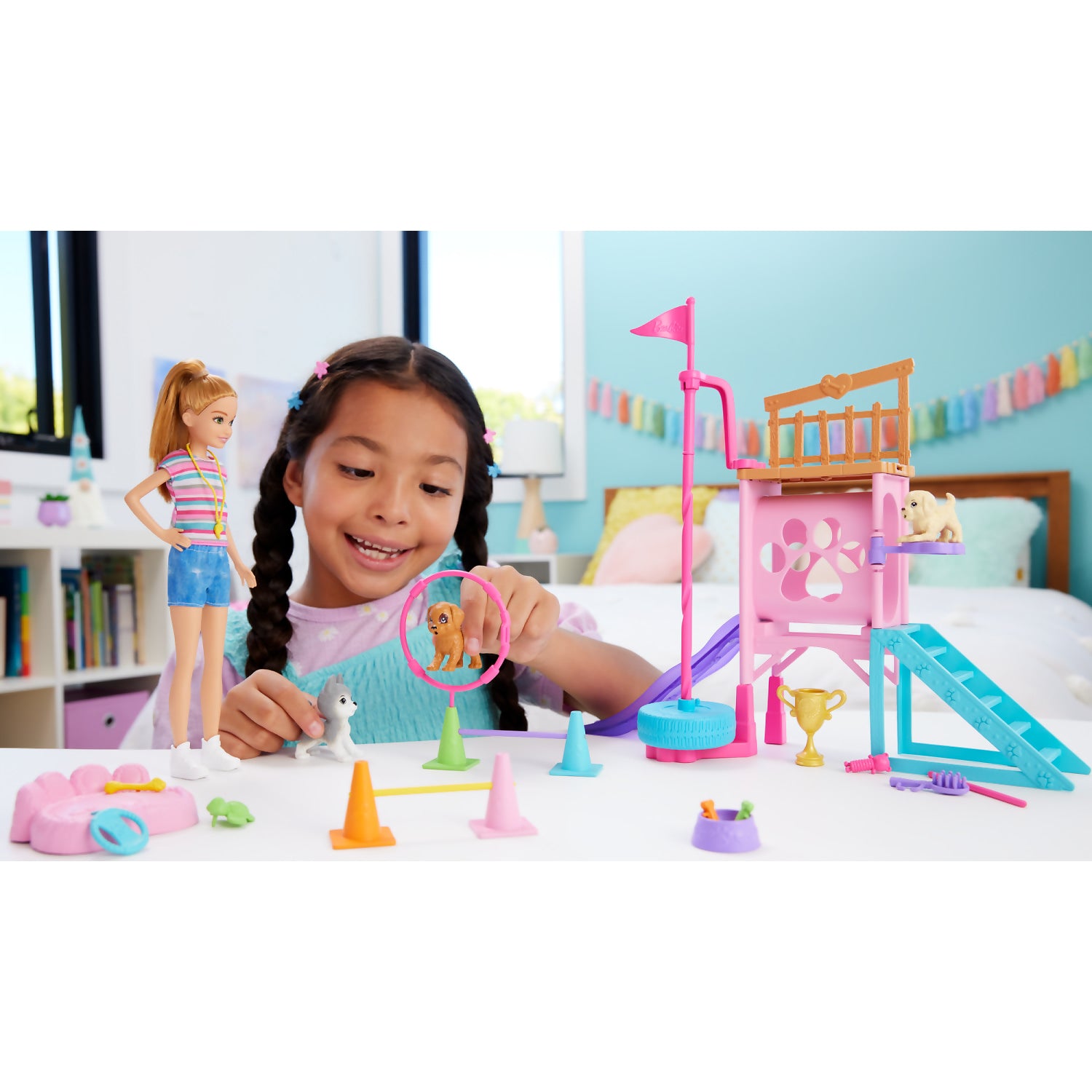 Pounce into fun with this puppy obstacle course playset! With 20+ pieces, there are so many ways to play with Stacie doll and her pack of three pups. The dogs can spin down the tire tower, slip down the slide, jump through hoops, and so much more with this buildable puppy playground.