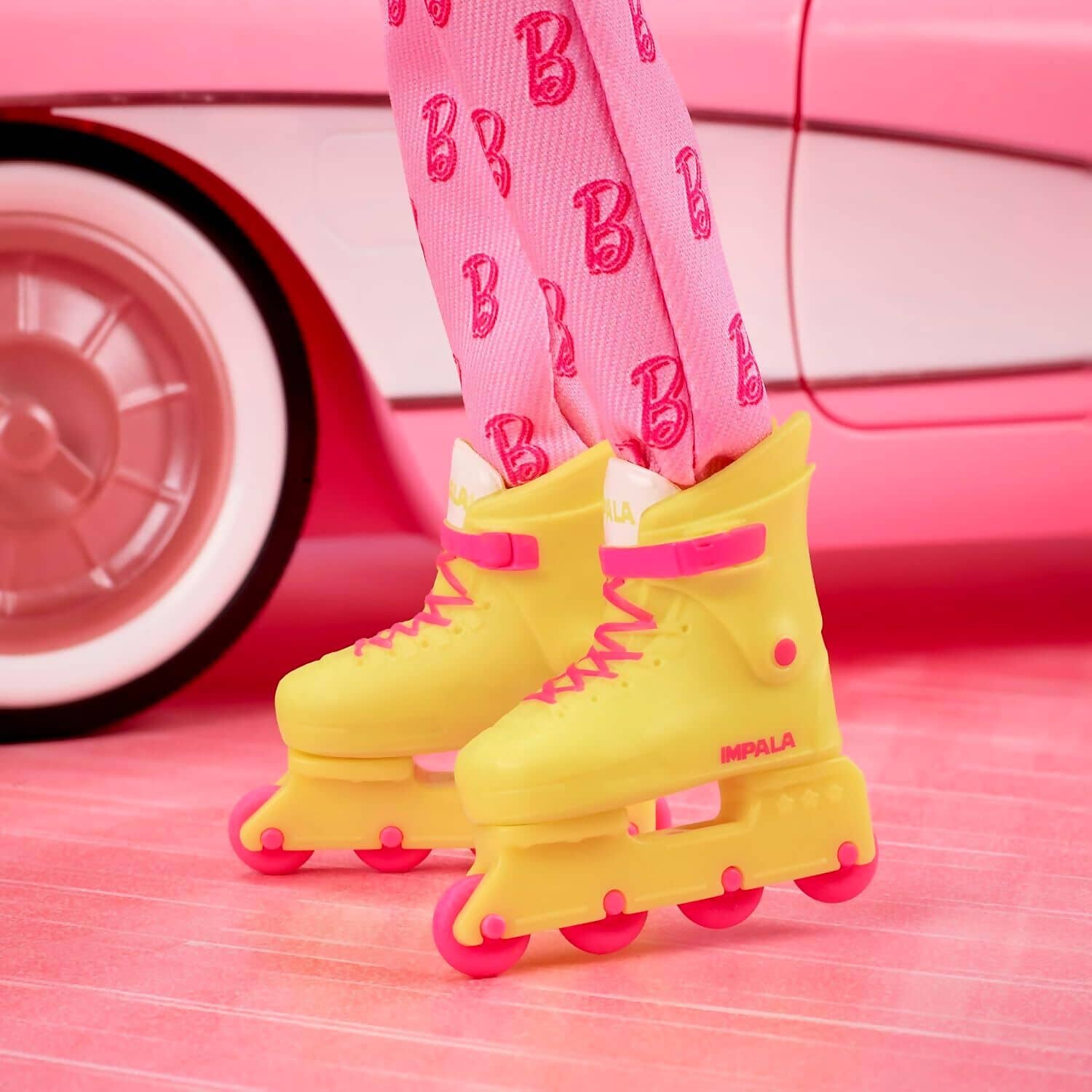 - Includes pink jumpsuit with Barbie “B” detail, white sneakers, and roller skates