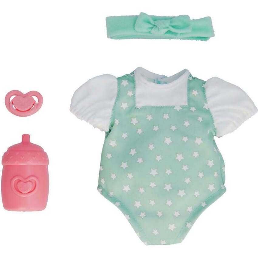 Sam is dressed in blue overalls with white stars, a white short-sleeved t-shirt, and a blue headband. Complete with a dummy and feeding bottle.