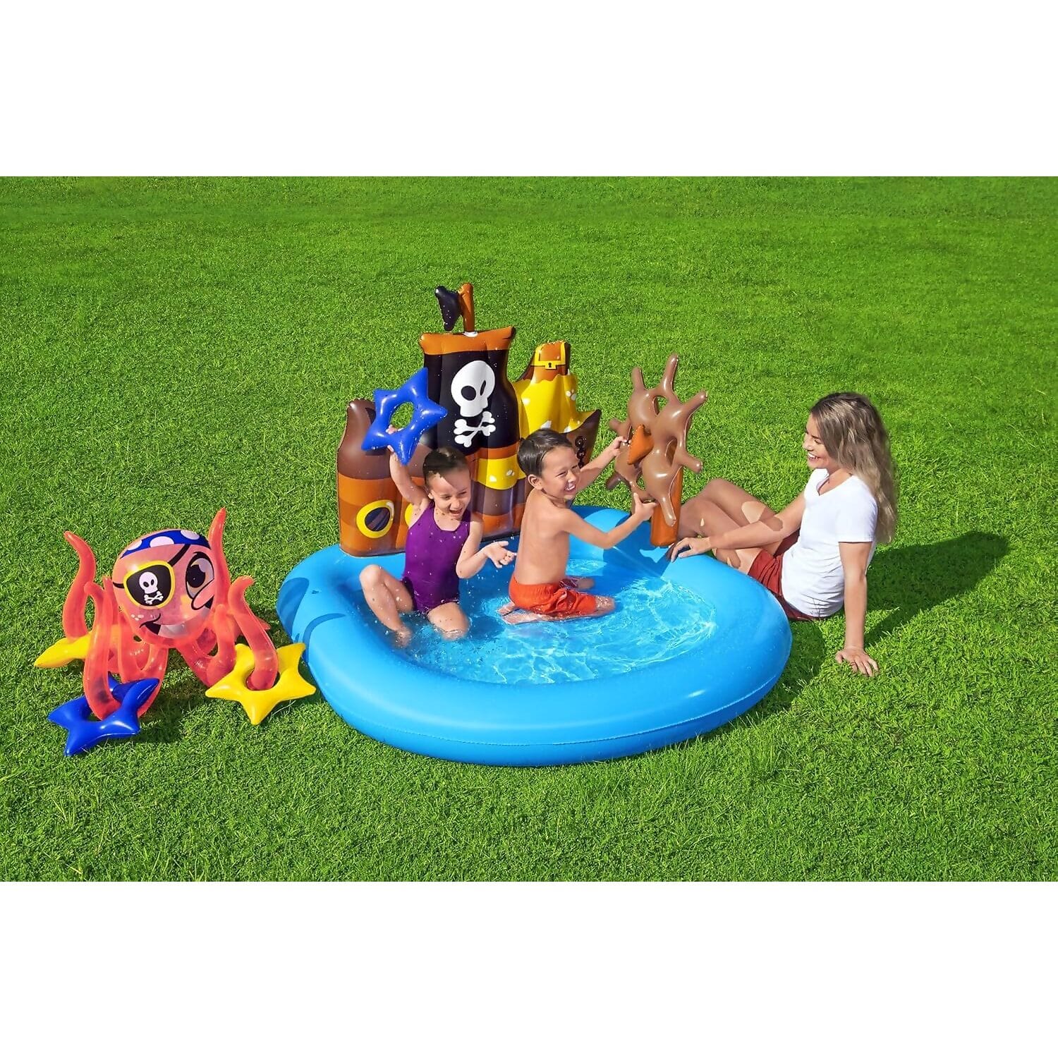 - Includes inflatable pirate octopus and four inflatable rings