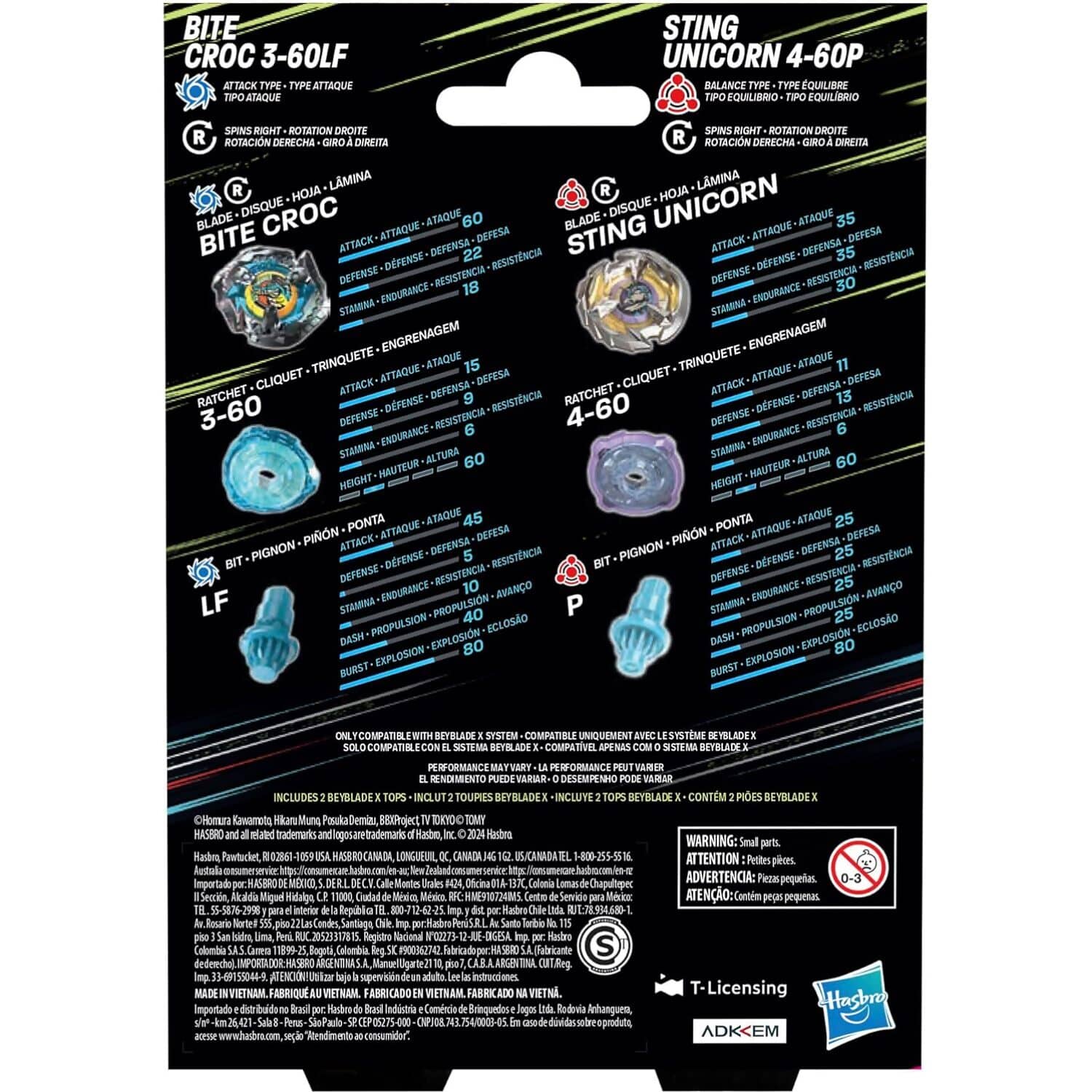 - Includes 2 right-spinning Beyblade X tops: Bite Croc 3-60LF and Sting Unicorn 4-60P