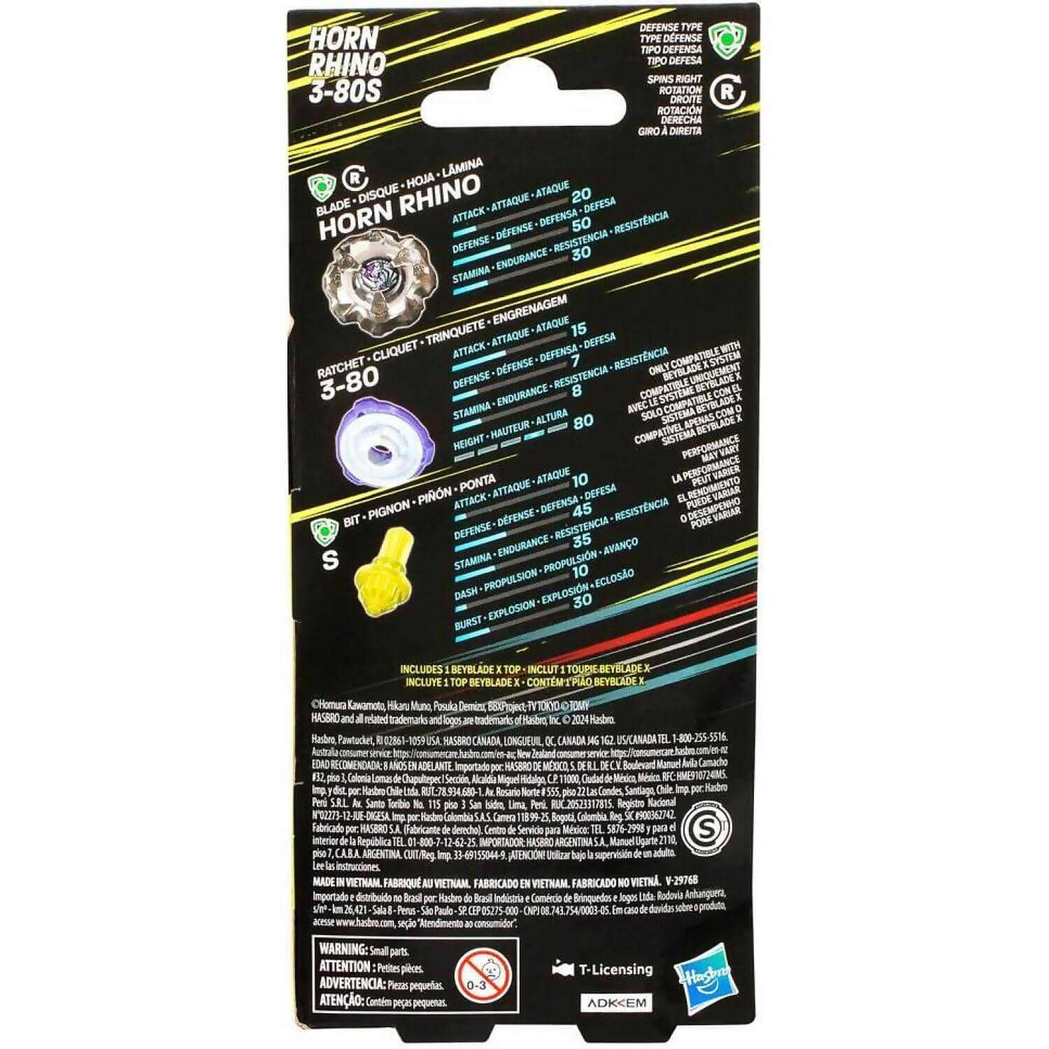Experience the thrill of the next generation of Beyblade stadiums, launchers and tops: Beyblade X with the Beyblade X Horn Rhino 3-80S Booster Pack Set which includes 1 right-spinning Defense Type top (Beystadium and launcher required, sold separately).