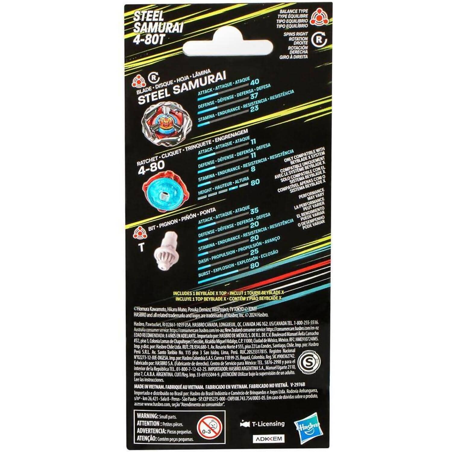 Experience the thrill of the next generation of Beyblade stadiums, launchers and tops: Beyblade X with the Beyblade X Steel Samurai 4-80T Booster Pack Set which includes 1 right-spinning Balance Type top (Beystadium and launcher required, sold separately).