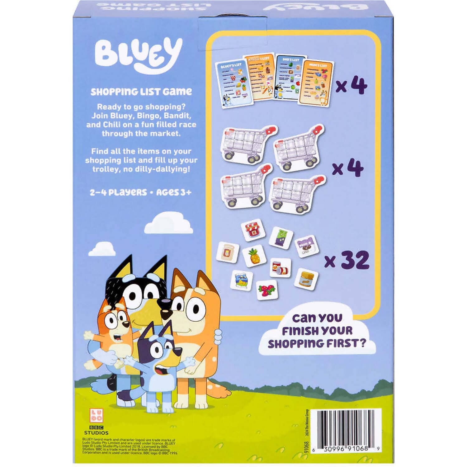 Join Bluey, Bingo, Bandit and Chilli on a cheerful supermarket adventure with the Shopping List Game! Players race to collect tasty and colourful groceries like lollipops, corn chips, flowers, and peanut butter. With bright illustrations and familiar characters, this game brings Bluey’s world to life in a fun and engaging way.