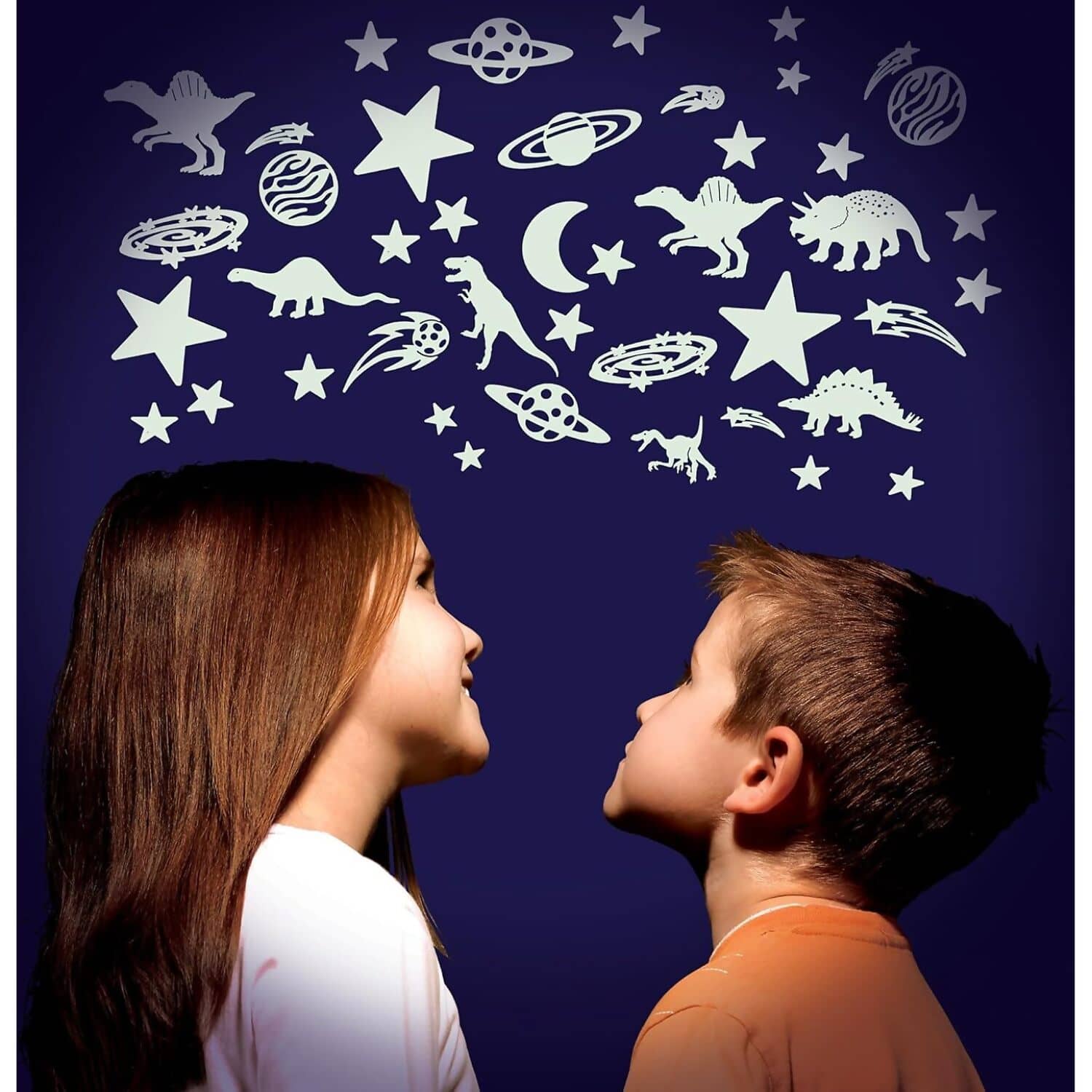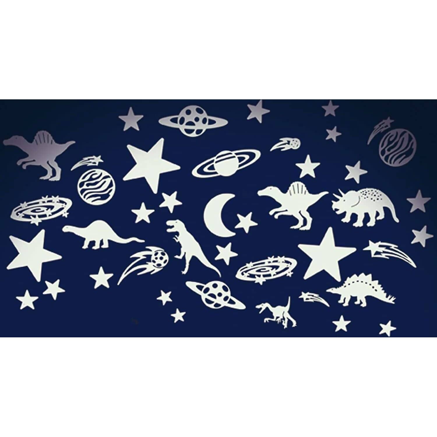 Create a prehistoric glowing landscape with the Brainstorm - The Original Glowstars Company Glow In The Dark Cosmic Glow - Glow Dinosaurs. This exciting set features high-quality glow-in-the-dark plastic dinosaurs and stars that bring Jurassic adventures to life on walls, ceilings and personal items. Simply expose the pieces to a light source and watch them glow brilliantly in the dark.