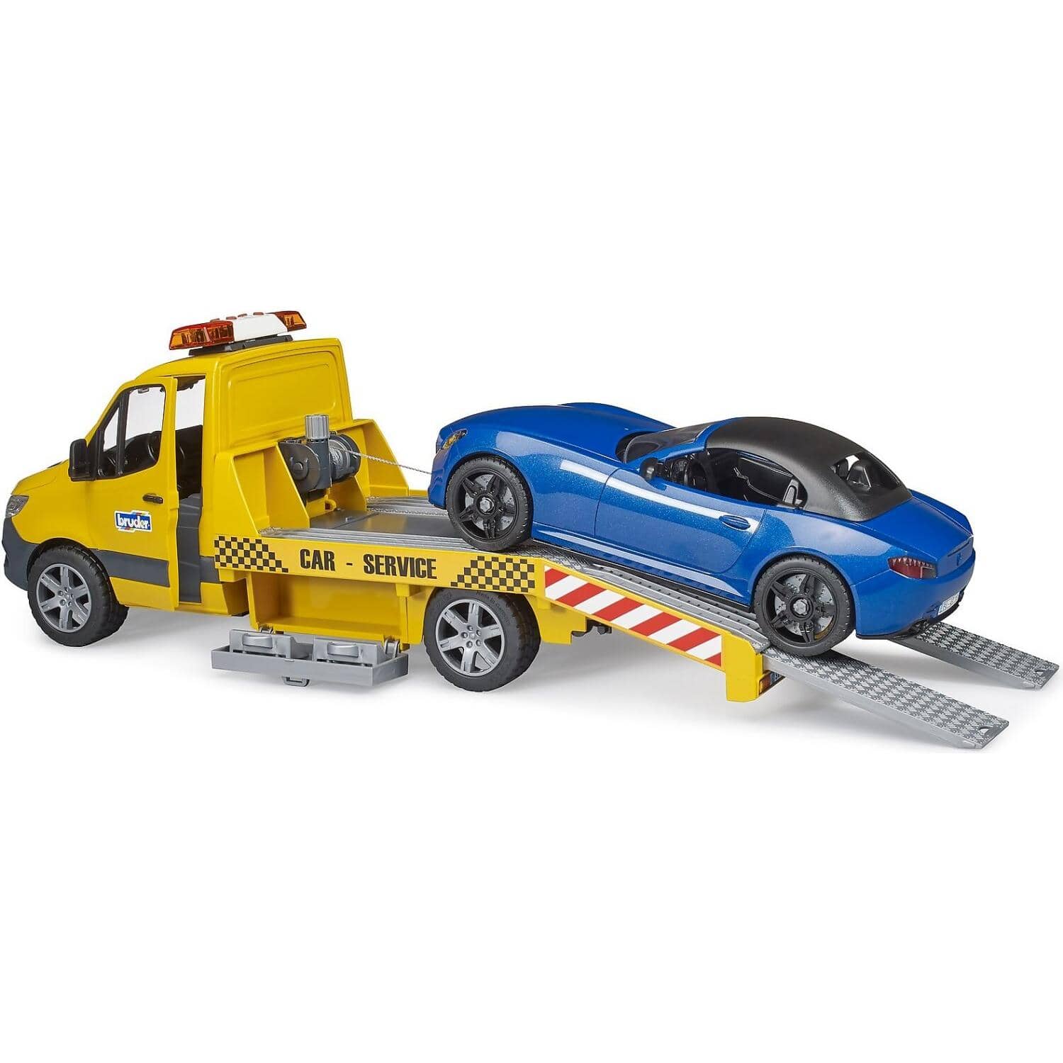 - Includes a new BRUDER roadster with a detachable roof