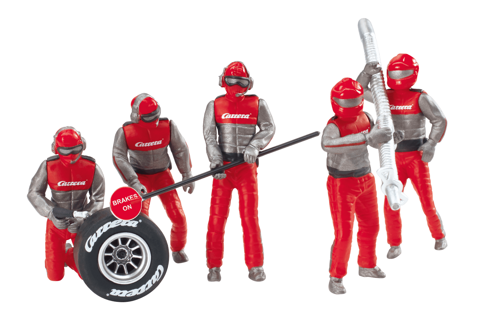 At the Pit Stop, the mechanics ensure that tyres are changed, technical problems are repaired and the car is good to go again. It goes without saying that the mechanics will also be present on the Carrera race track! The Carrera mechanic crew consists of five figures in red outfits. In addition to the detailed workmanship, the modern figures also win you over with their different, adjustable or rotatable body parts. The mechanics cut an excellent figure and perfectly complement your Carrera race track. An authentic, lovingly designed race track is guaranteed with the mechanic™s figure set! This means a pit stop can take place with mechanics, like in a real race.