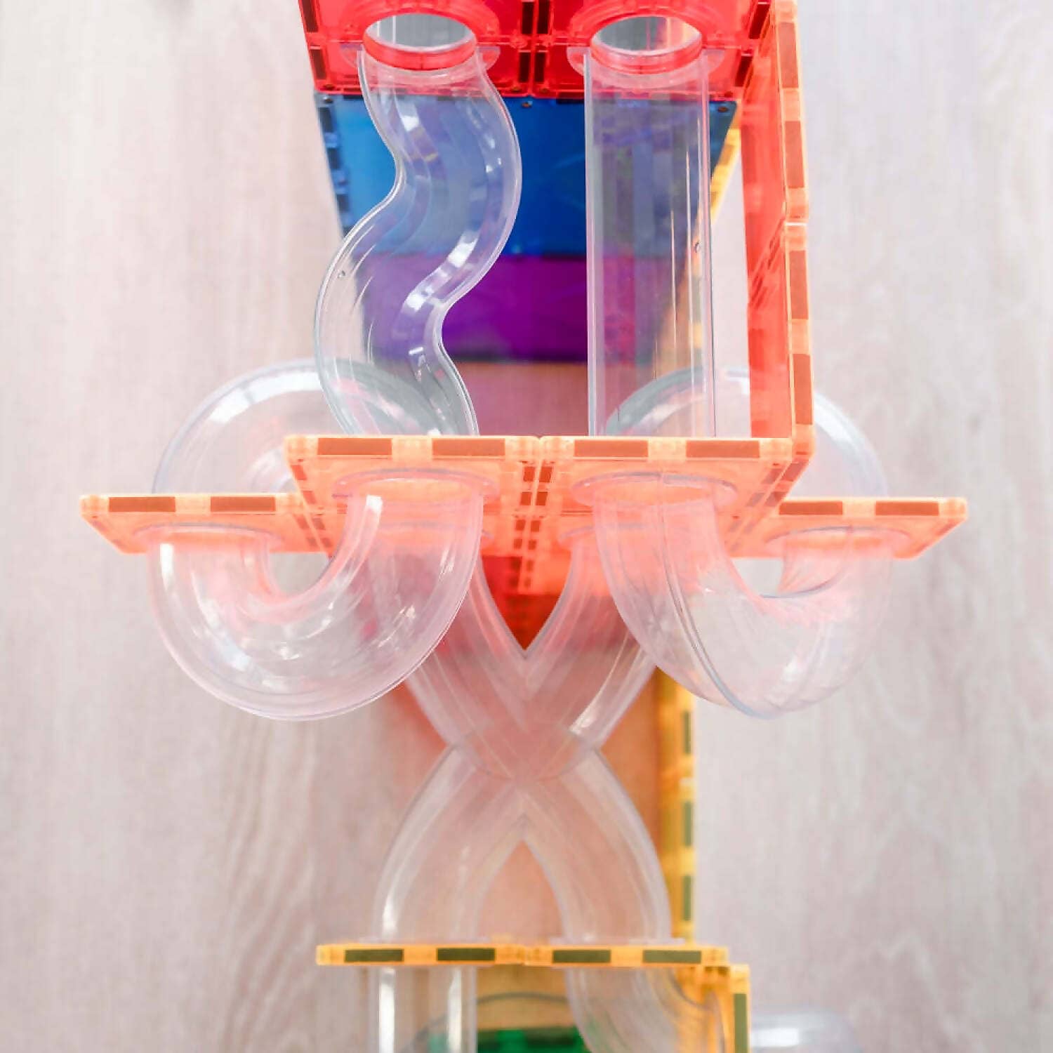 This open-ended expansion pack includes connector square magnetic tiles in 6 vibrant colours, rainbow wooden balls plus a range of clear, fluted tubes so you can explore motion and gravity like never before. Redirect and pivot the action with the intersecting X-shape tubes, play collaboratively and race together in unlimited ways with the double-entry bowls, create eye tracking fun with the spiral pieces, plus 1/2 and 1/4 piece tubes for even more twisting, turning action!