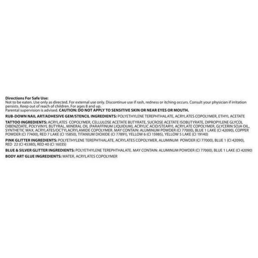 Set includes: 2 Sheets Rub-Down nail Art, 1 Sheet Tattoos, 3 Pots Glitter, 1 Sheet Adhesive Gems, 1 Sheet Stencils, 1 Body Art Glue, 2 Applicators and instructions.