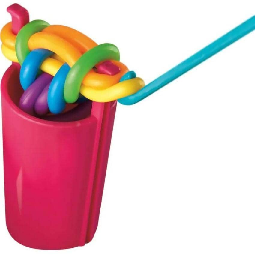 Set includes: 1 2-Prong Loom, 1 Mini Weaving Hook, 100 Latex-Free Squish Bands, 15 “C” Hooks and Instructions. Suitable for ages 6+.