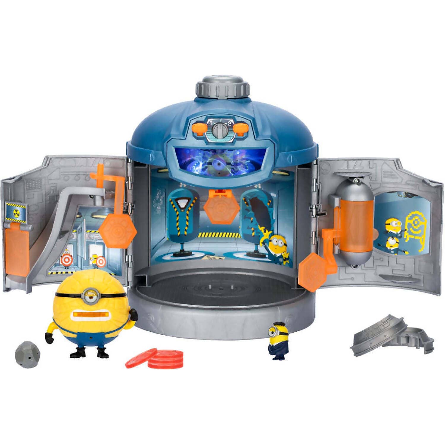 Watch out for falling rocks as they roll down the shoot! Fire out discs from Mega Minion Jerry's mouth to hit the targets. This awesome transforming playset is battery powered and full of lights and sounds to delight everyone! Includes 2 figures, 6 accessories and 3 AAA batteries.