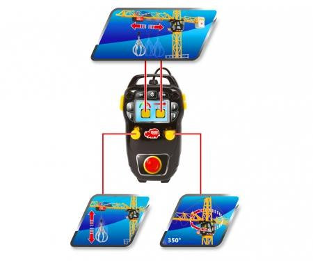 What about being as big as a crane and seeing how it works close up No problem with the Dickie Toys Construction Mega Crane. The 1.2 meter toy crane with cable remote control is a present that is sure to make children's eyes light up. The crane cabin rotates by 350 degrees at the press of a button, the trolley and winch move just like the full-size version. The various attachments allow all kinds of building materials to be transported. And of course there is a cute character in the open cabin with a new job as a crane driver.