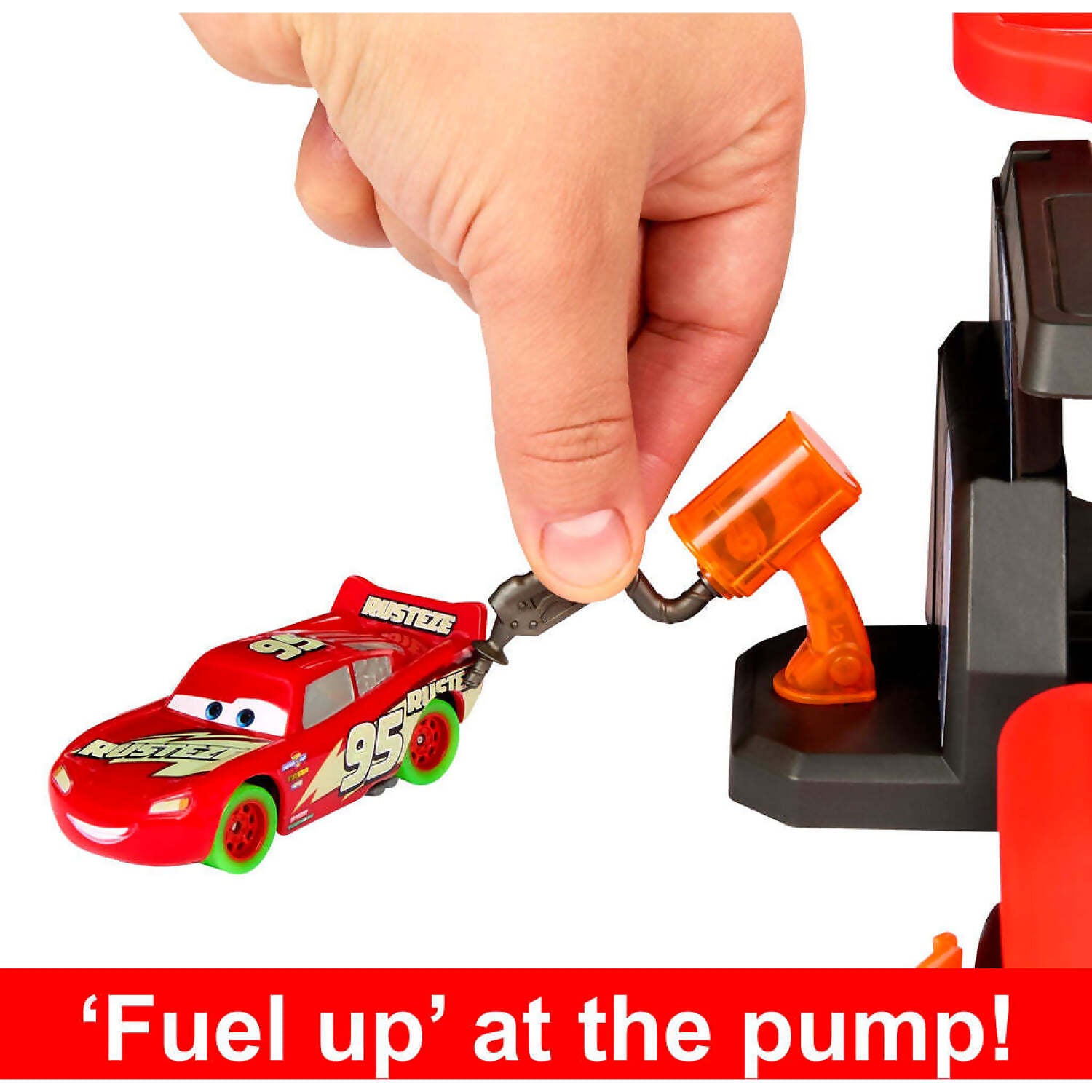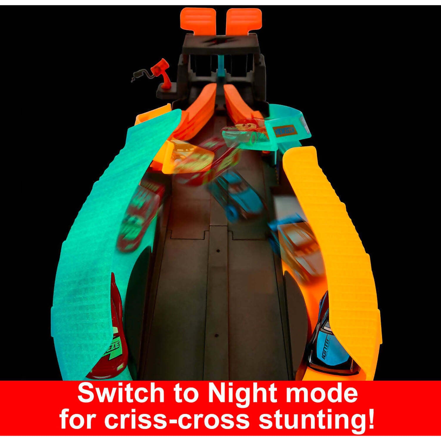 Ready, set, GLOW! Disney and Pixar's Cars star Lightning McQueen and his rival Jackson Storm are in a vibrant new race. The Launch & Criss-Cross Glow Race playset is a brilliant way to showcase the glow-in-the-dark Cars Glow Racers vehicles.