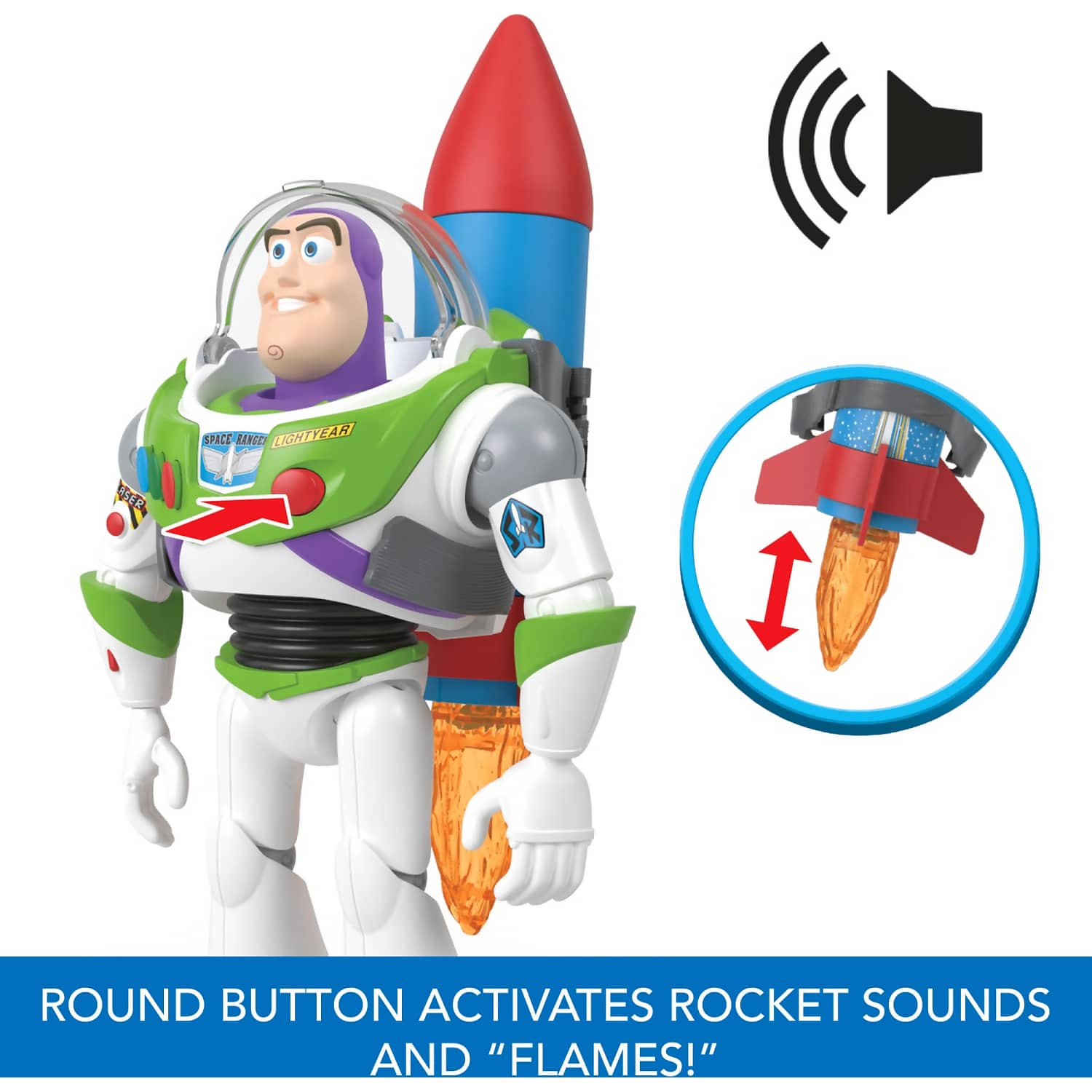 - This large-scale Rocket Rescue Buzz action figure toy brings home the fun and friendship of Disney and Pixar's Toy Story and, with the rocket strapped to Buzz Lightyear's back, recalls the heart-tugging moving day scene.