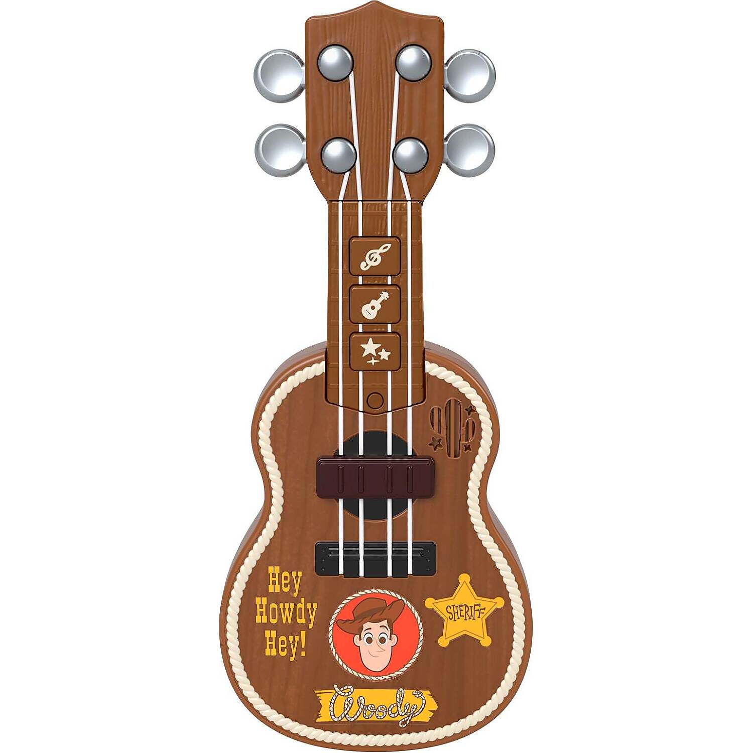 - Toy Story‑themed guitar featuring Woody’s signature design