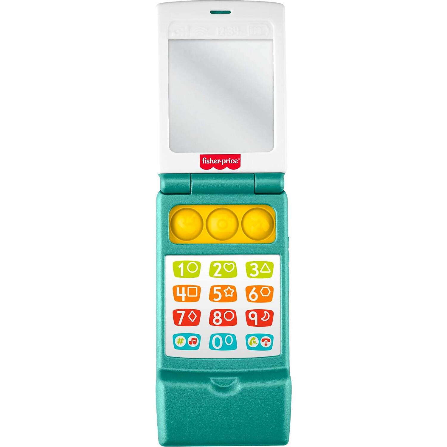 The Fisher‑Price Laugh & Learn Flip Phone introduces babies to early pretend play with a colourful, easy‑to‑hold toy designed to look like a classic flip phone. When opened, the top half reveals a baby‑safe mirror that encourages self‑recognition and visual exploration. The bottom half features bright buttons with numbers, shapes and playful icons to support early learning.