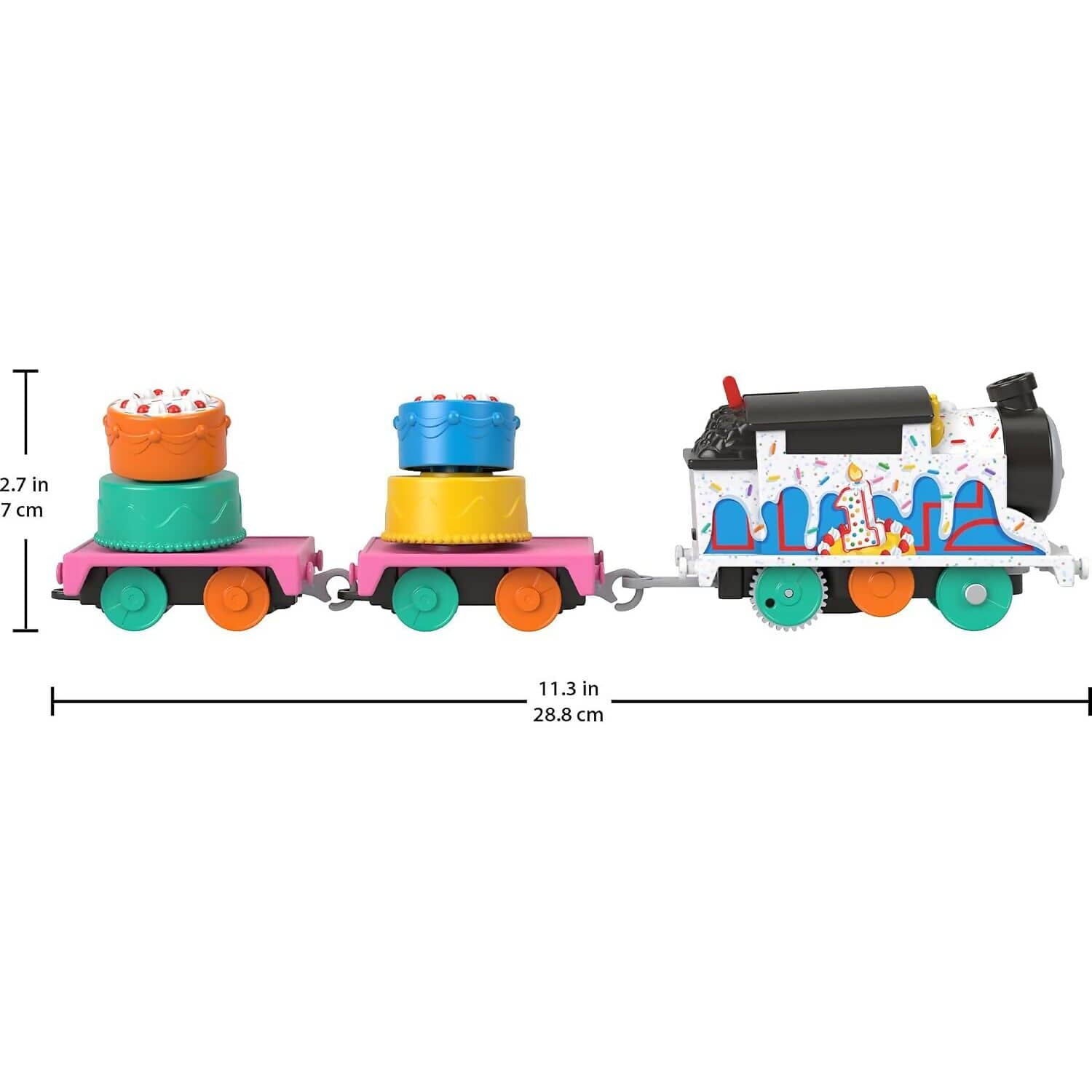 Preschoolers can celebrate with Thomas in a sweet and silly way with the Wobbly Cake Thomas motorised engine from Fisher-Price. Styled to commemorate a festive moment from the Thomas & Friends™ series, this cheerful engine features colourful cake-themed decorations and a wobbly cargo car. With the flip of a switch, Thomas zooms along the track, ready to deliver his delicious-looking load.
