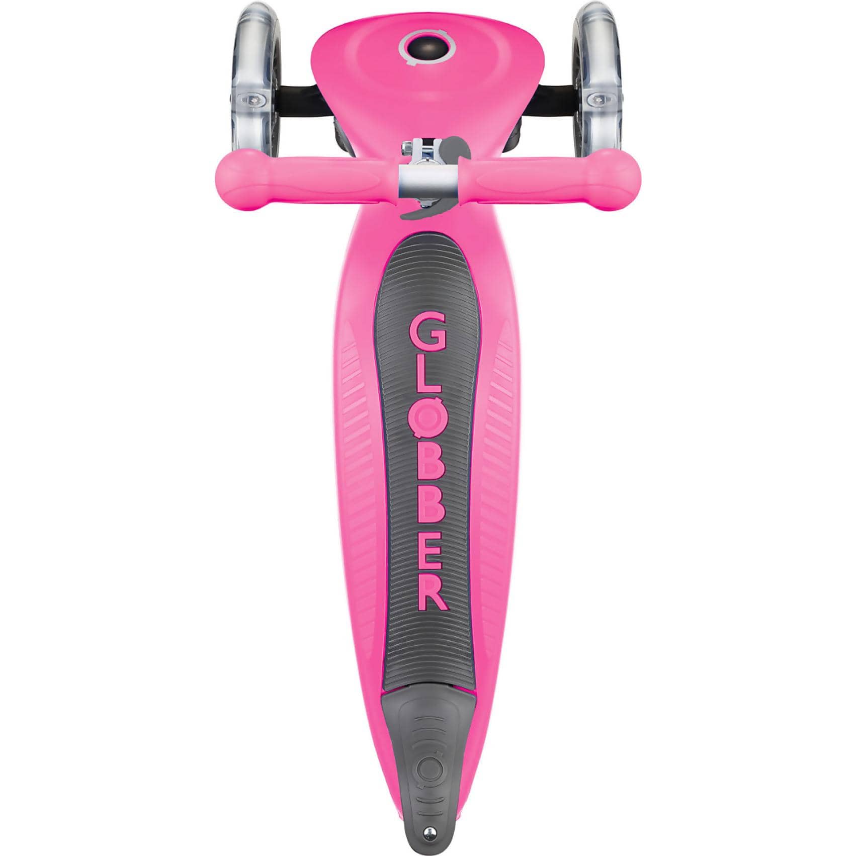 - 3-wheel foldable scooter with Globber’s patented folding system with a safe push-button that folds the scooter into trolley mode. Conveniently carry, roll, or store it away after playtime!
