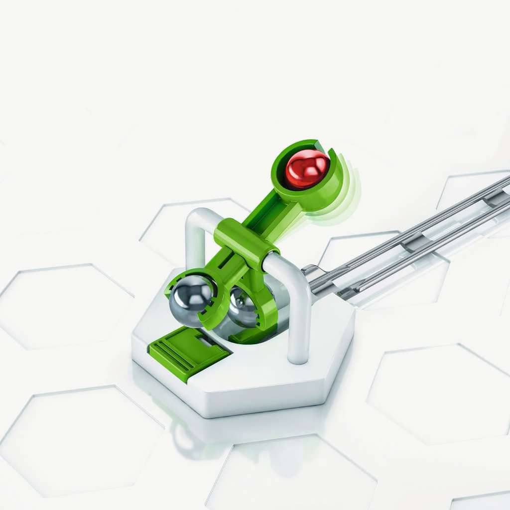 Keep your marble run excitement going with the Scoop. Triggered automatically when the marble rolls into it, the Scoop picks up the marble, swings like a trebuchet and propels the marble down the track of the next highest level. This accessory also includes 6 additional tracks and must be combined with the GraviTrax Starter Set(sold separately)