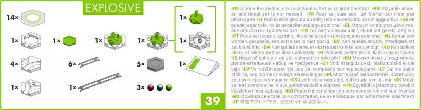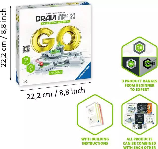 GO Explosive is made for beginners to get to know the GraviTrax universe - just unpack and get started. Can be combined with all GraviTrax products.