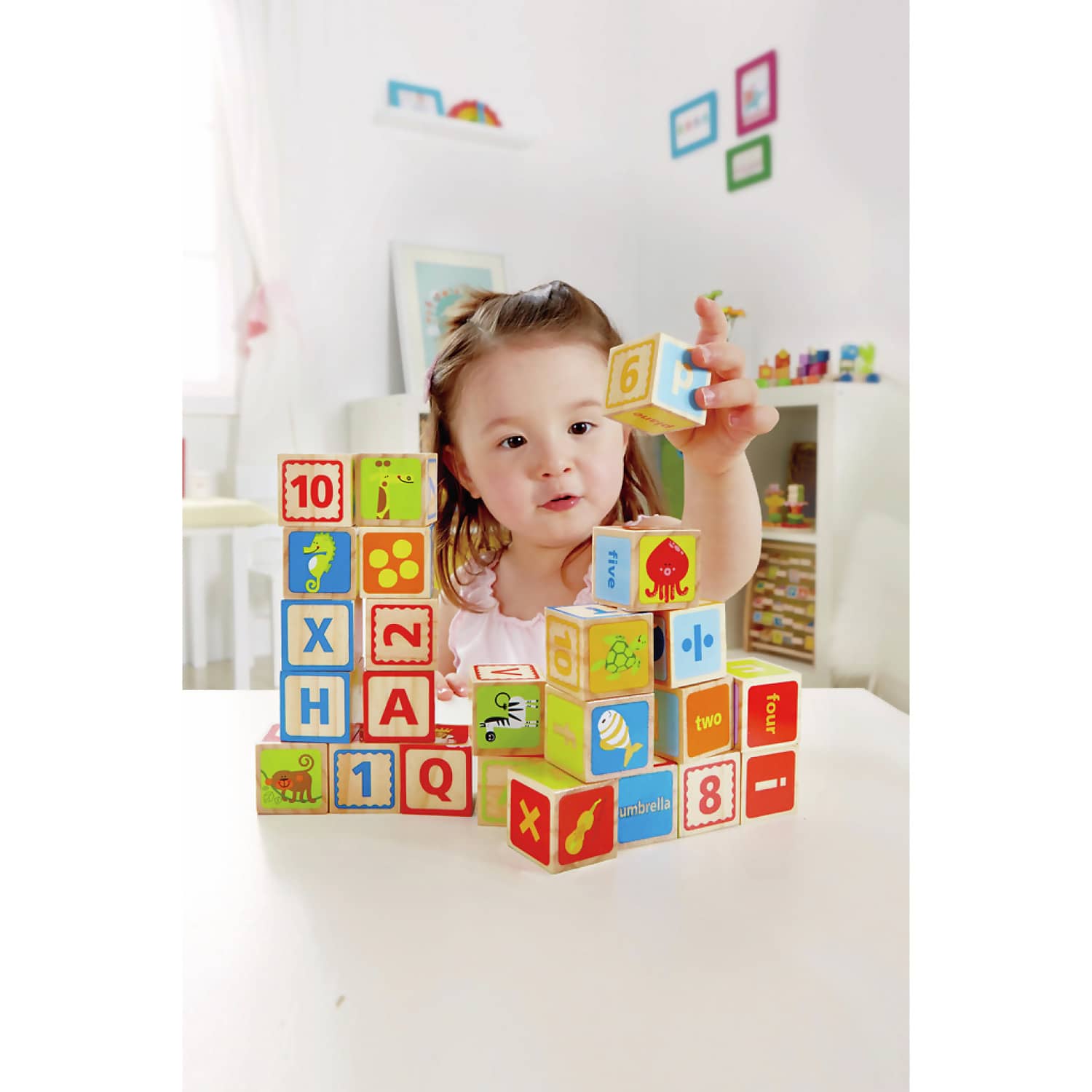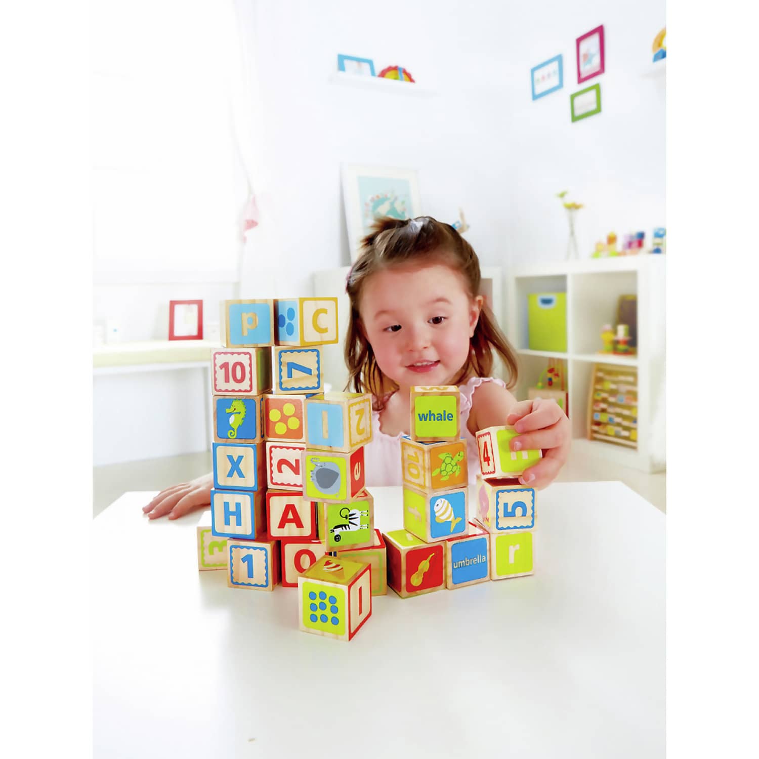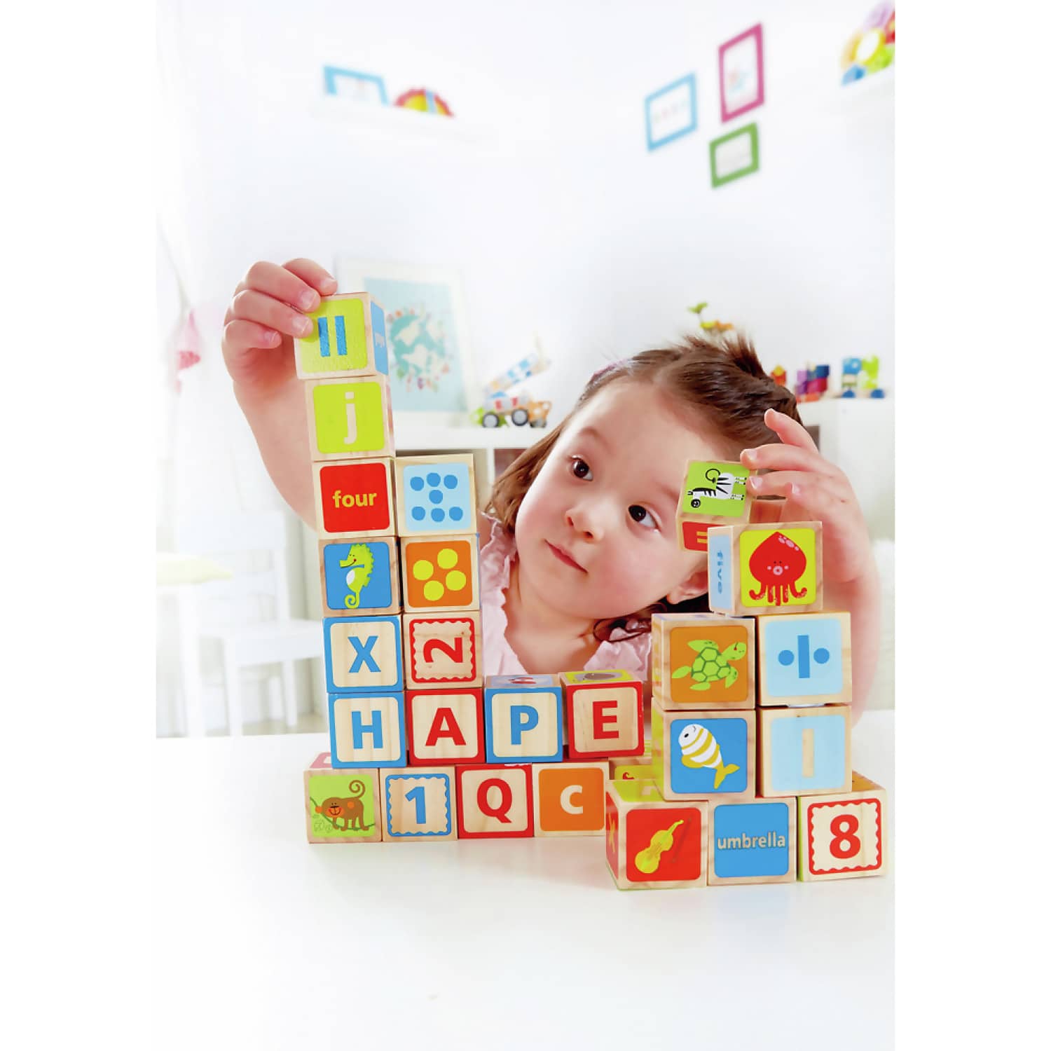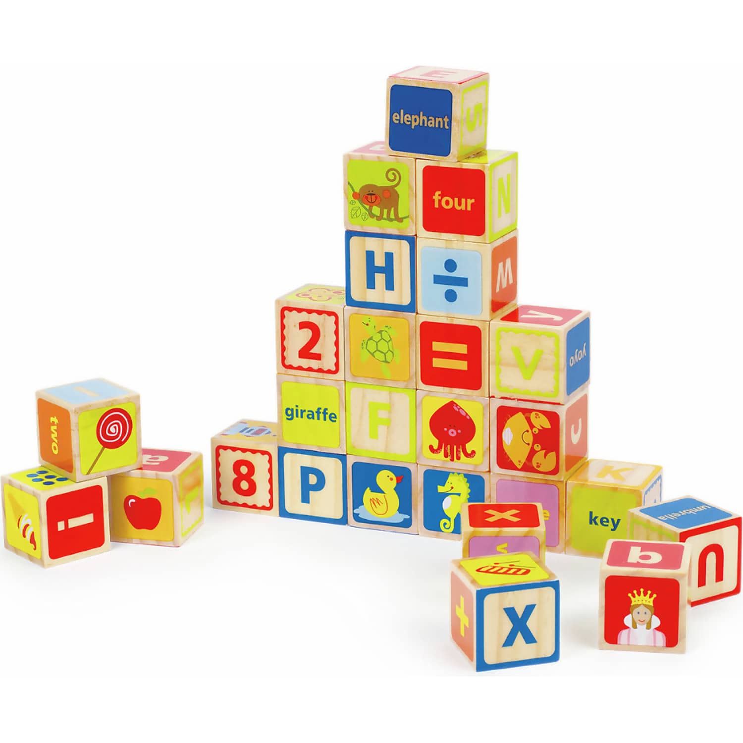 - Includes 26 wooden blocks featuring letters, numbers, and pictures