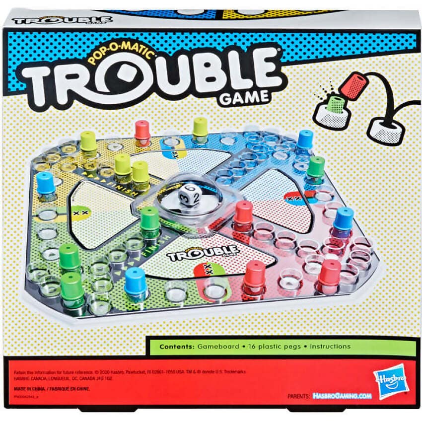 The Trouble Game Pop-O-Matic is a classic race-and-chase board game designed for family fun. Players press the iconic Pop-O-Matic bubble to roll the die, moving their pegs around the board while avoiding setbacks. The first player to get all four pegs into the Finish Zone wins, making every round a thrilling competition.