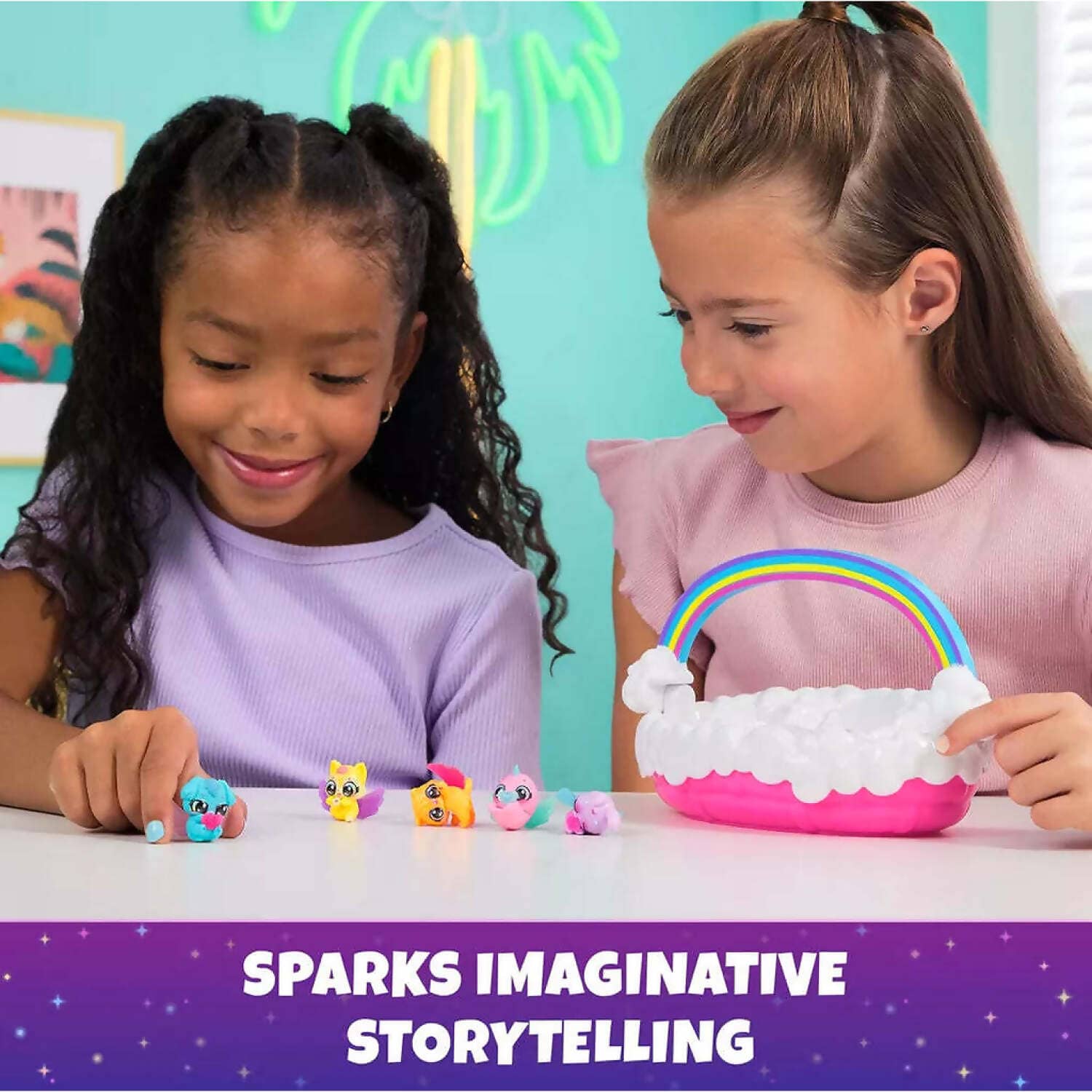To start hatching, remove the 3 pacifiers from the eggs, fill the bottle with water and squeeze it into the eggs. In seconds, a Bunnypie, Puppadee and Narwing will start revealing themselves, cracking through the eggs. Display your characters inside the Easter basket or use your imagination to play out your own adventures. There’s a booster seat and pillow molded in the basket and the pacifiers fit into each figure’s mouth for nurturing play. Lift the rainbow handle and take your neon Hatchimals friends with you anywhere you go.