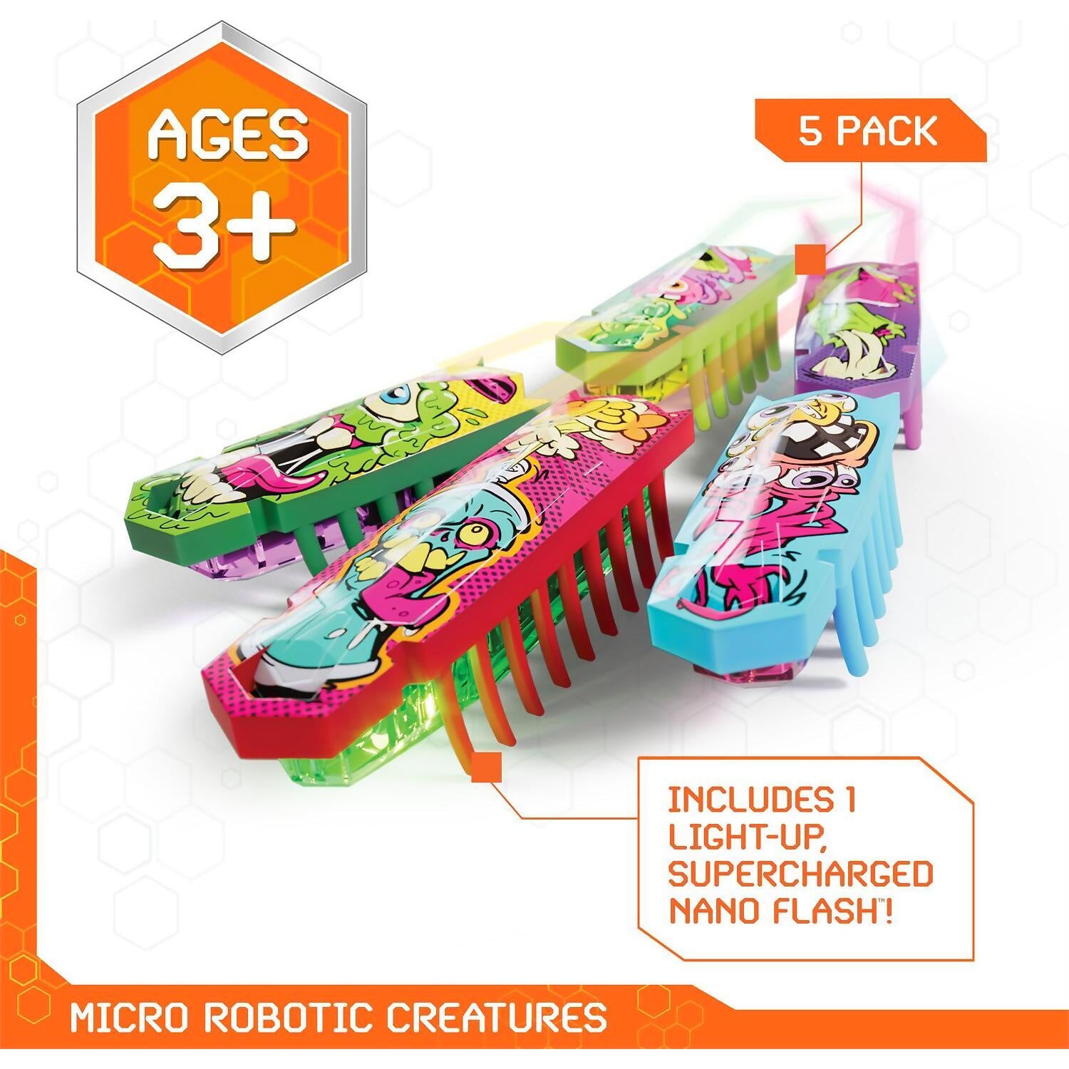 Expand your nano universe with the HEX BOTS Nano 5-Pack, with 4 Nano robots and 1 Flash Nano! Just like a real bug, these Nanos scurry across any surface, flip themselves over, and bounce off jelly walls.