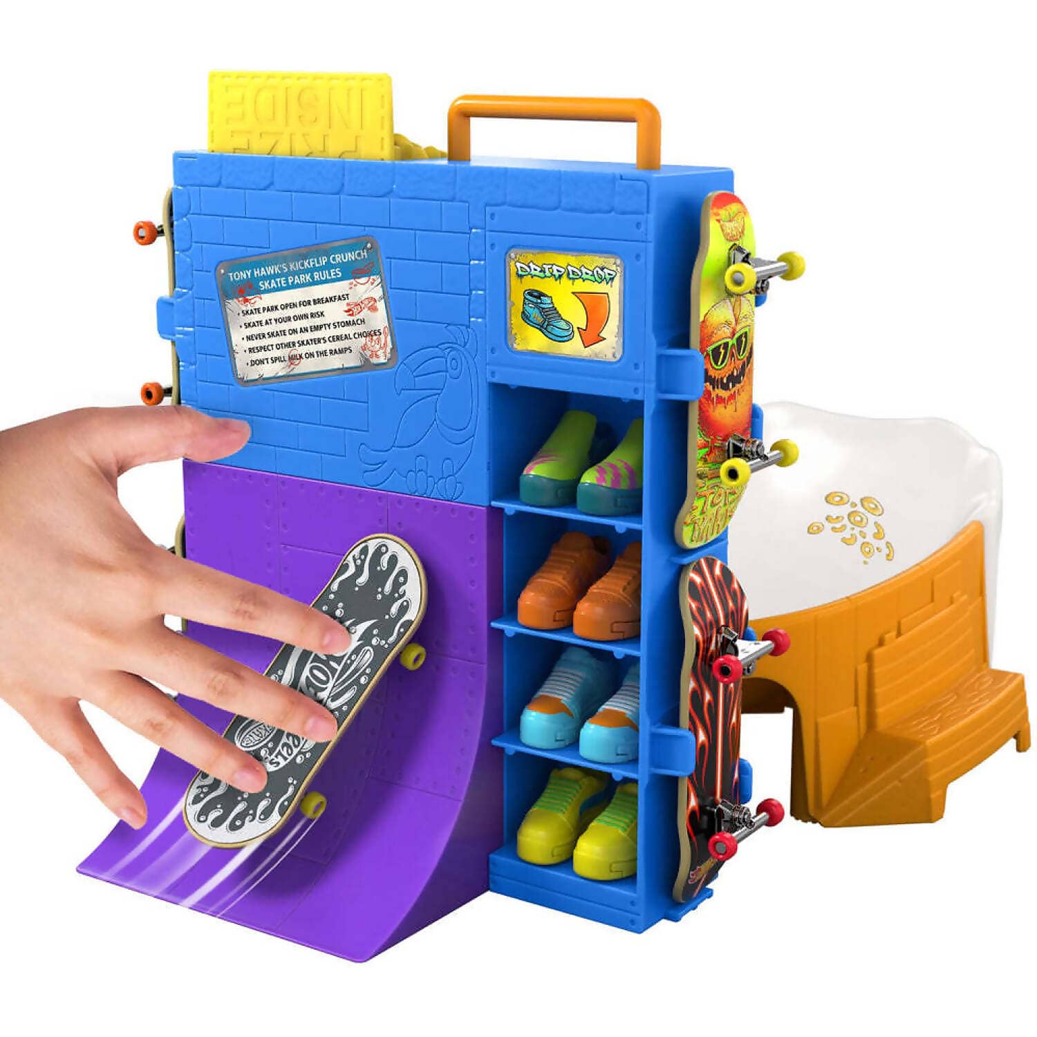 Shred through an epic bowl of cereal with the Hot Wheels Skate™ Tony Hawk Cereal Skate Bowl. Created in collaboration with skateboarding legend Tony Hawk, this cereal-themed skate set invites fingerboarders to skate through a cereal bowl, perform vert tricks on the cereal box before grinding the rail at the top for a surprise trophy reveal.
