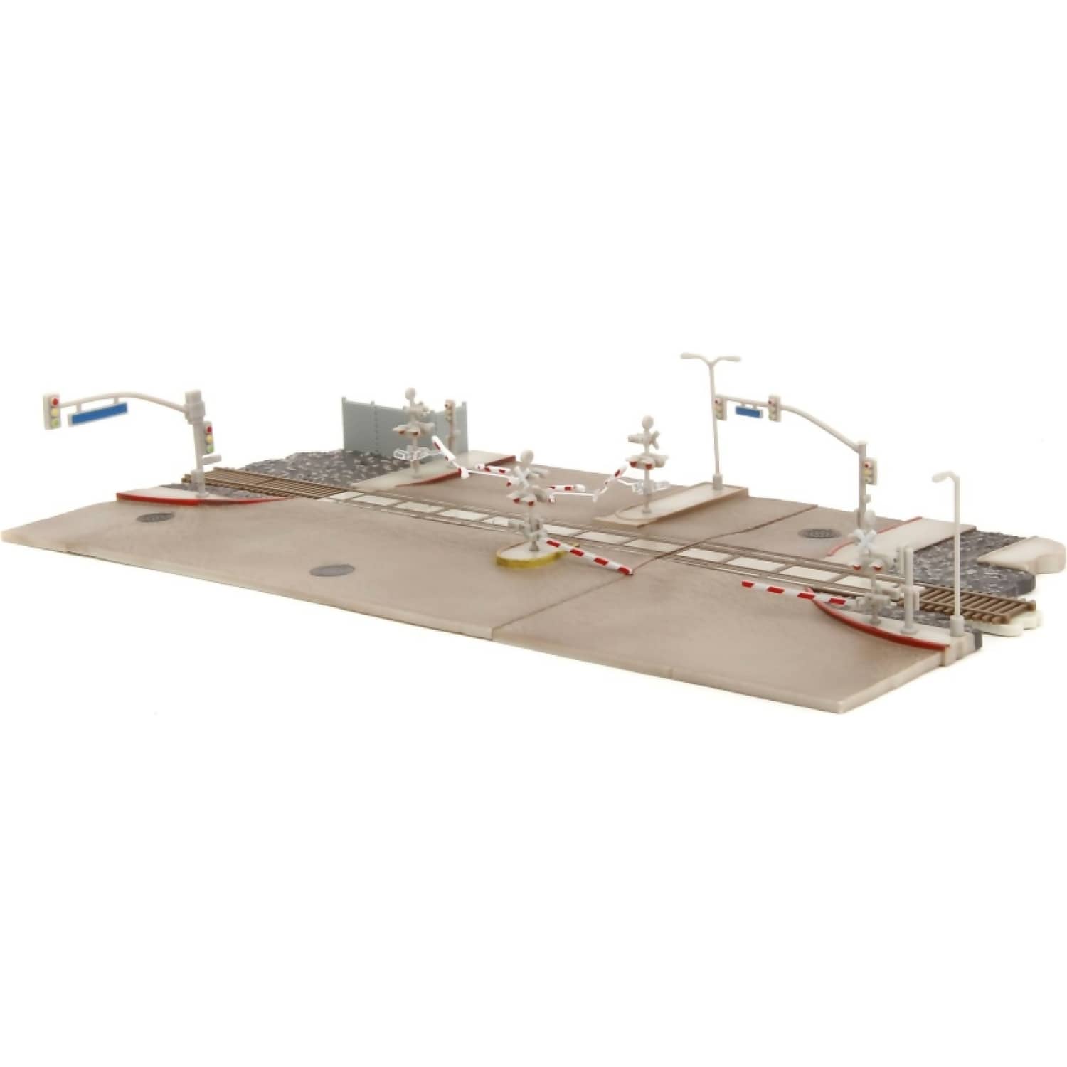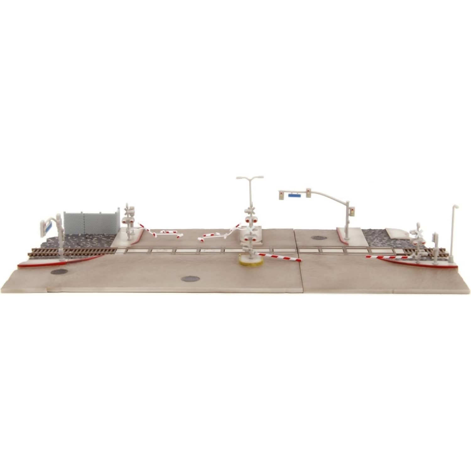 - Functional railway crossing with barriers, traffic lights, and moving train