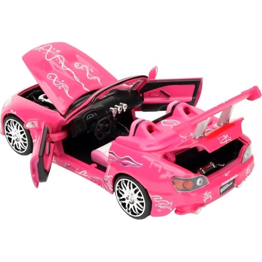 Crafted from diecast metal with plastic components, the model includes opening doors, bonnet, and boot, revealing a detailed interior and engine bay. Real rubber tyres and free-rolling wheels enhance its realism and display appeal. Whether showcased on a shelf or used for imaginative play, this S2000 delivers attitude, colour, and Fast & Furious energy.