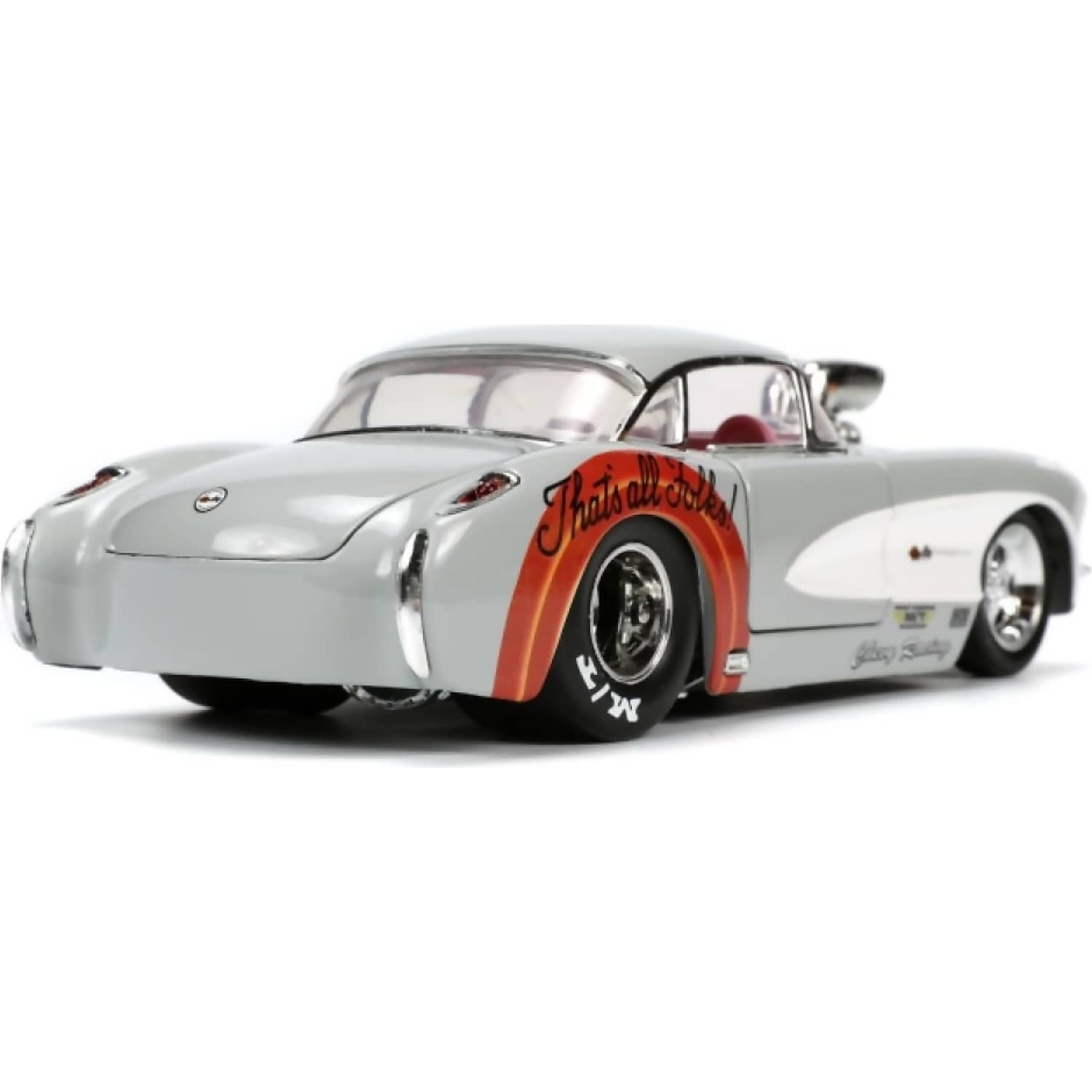 Hop into nostalgia with the Looney Tunes 1957 Chevrolet Corvette, recreated in 1:24 scale by Jada Toys. This officially licensed diecast model features a sleek grey finish with playful white side panels that mimic Bugs Bunny’s furry belly. With its classic curves and character-themed styling, it’s a whimsical fusion of vintage automotive design and animated charm.
