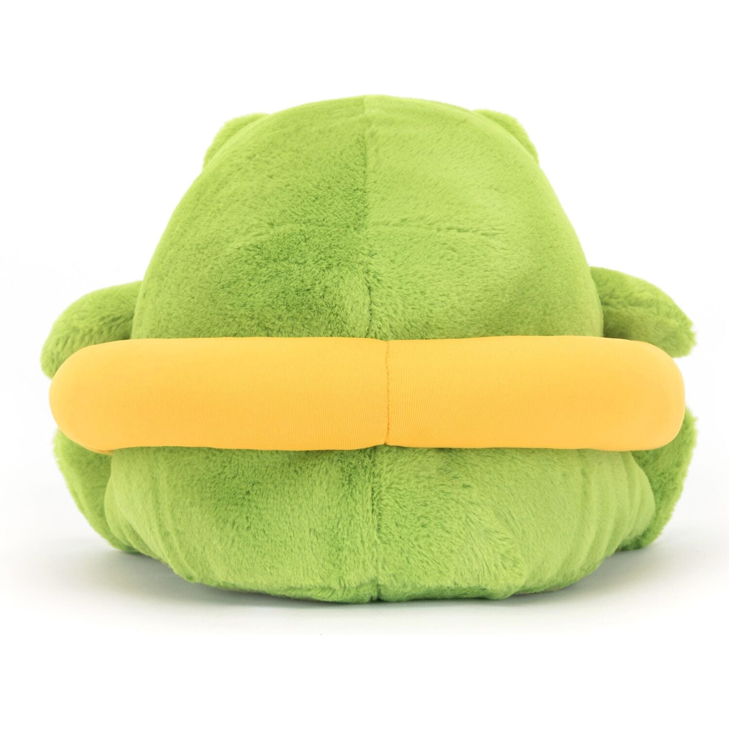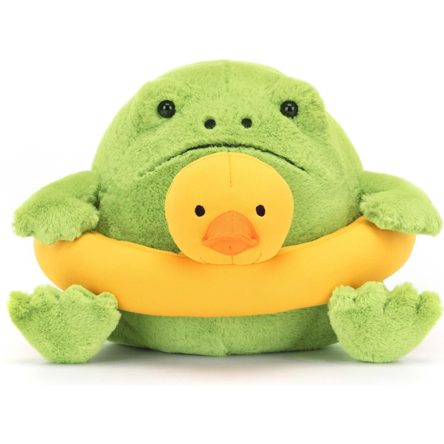 Our favourite grumpy frog has found a duck rubber ring in bright yellow cotton to compliment his soft, pea-green fur.