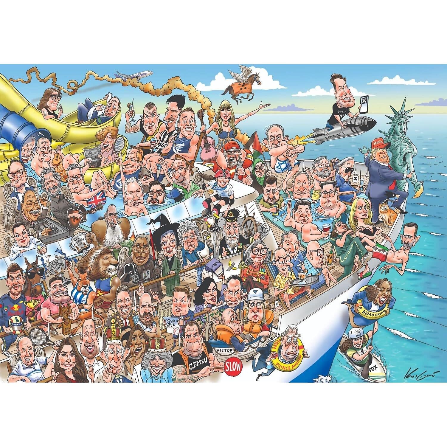 Dive into the satirical brilliance of Mark Knight with this 1000-piece 2-in-1 jigsaw puzzle from Kick Ass Games. Featuring a vibrant collage of caricatures, the puzzle captures a humorous snapshot of celebrities from politics, sport, and entertainment. Once assembled, the artwork reveals a detailed scene packed with recognisable faces and clever visual storytelling.