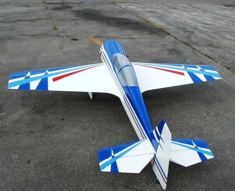 Kit includes: Using a new composite technology, we were able to come up with extremely light airplane. And if you use a single cylinder 85ccm engine, you will get an incredible power to weight ratio!! What we would like to point out?? A high prefabrication of this ARF and it's perfect quality!- canopy and cowl are installed- alu landing gear ready to be attached- rudder servo tray glued in- bulkheads installed- fuel and smoke tank holders glued in- wings servo bays installed- predrilled location for control horns an all surface- predrill plates for different engines included- and of course a huge area in fuselage when canopy latch is removed! Simply fast and effective work !!! By our estimates, time needed to complete this airplane is around 20 - 25 hours!! That's not too bad, right? Parts description:1 - Fuselage: vacuum sandwich with all bulk heads installed, including c/f inside canopy frame2 - Wings: vacuum sandwich. Alu wing tube 40mm, each panel needs 2 servos( JR 8711).3 - Elevators: vacuum sandwich. Can be taken apart if needed. Hinge wire is a brass tubing. Each half has one mount for JR 8711. Two alu tubes 10/1mm.4 - Rudder: vacuum sandwich. Hinge wire is a brass tube, removable on the bottom, if rudder needs to be removed for transportation.5 - Canopy hatch: Alu/titanium look - comes with every kit, standard equipment. Carbon fiber - must be ordered extra. Glued into canopy frame. ..NOT RECOMMENDED TO BE USED WITH 2.4Ghz!!!!!!!!Clear ( transparent) - must be ordered extra. Glued into canopy frame. Canopy frame is fitted on to fuselage from factory. Only two M4mm screws and two wooden dowels are used.6 - Cowl: f/g part. Fitted to the fuselage and attached using 8 M4 screws. Any 80 - 120ccm size engine will fit in without any problems.7 - Landing gear: alu, with all the holes predrilled. Wheel pants are f/g. We have come up with original paint schemes for this plane.