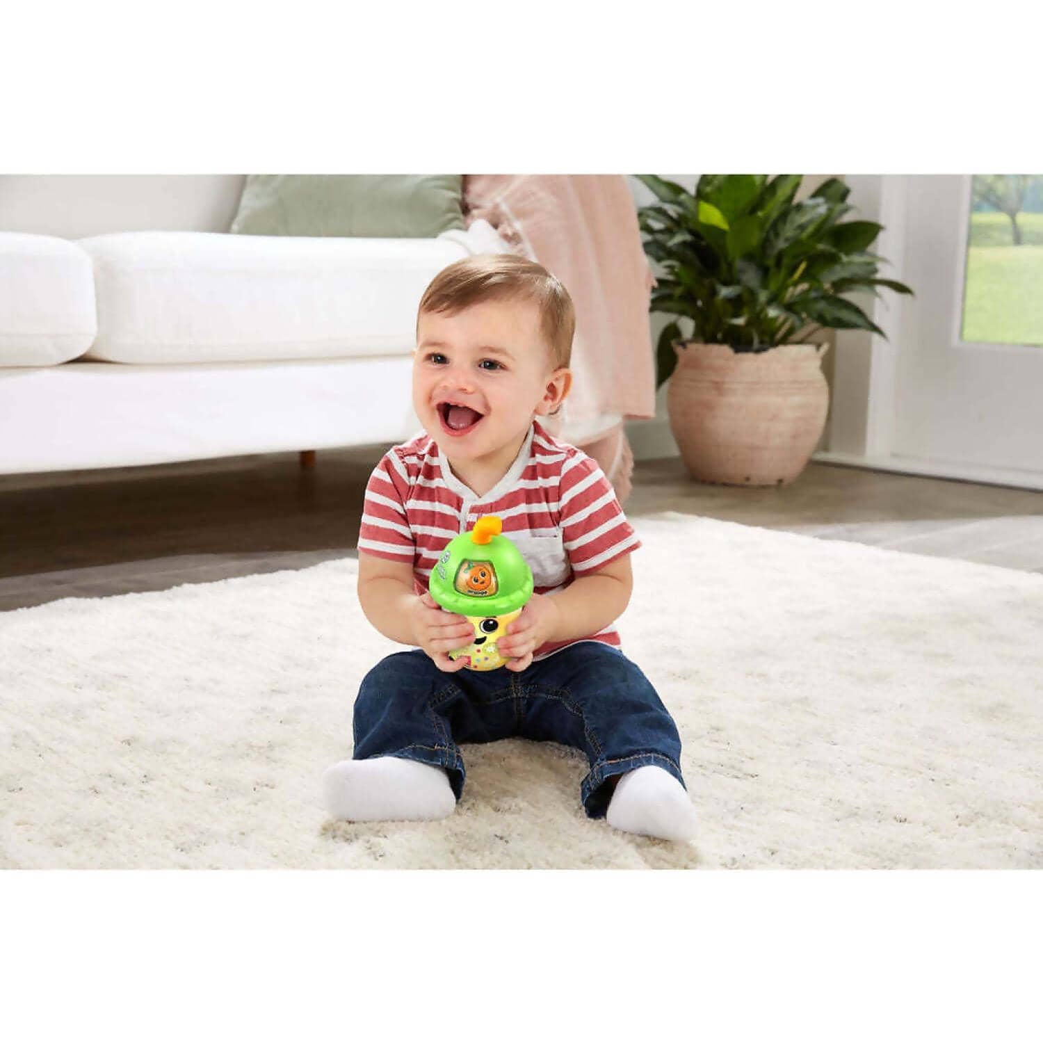 Meet Crystal the Cup plus five funny fruits like Sherry Strawberry and Oliver Orange who introduce themselves and their colours. The straw is also a teething toy for kids to nibble as they listen to fruit-themed sing-along songs and music in reggae, pop, punk rock and country styles. Shake up the toy smoothie cup to hear the bubble beads bounce.