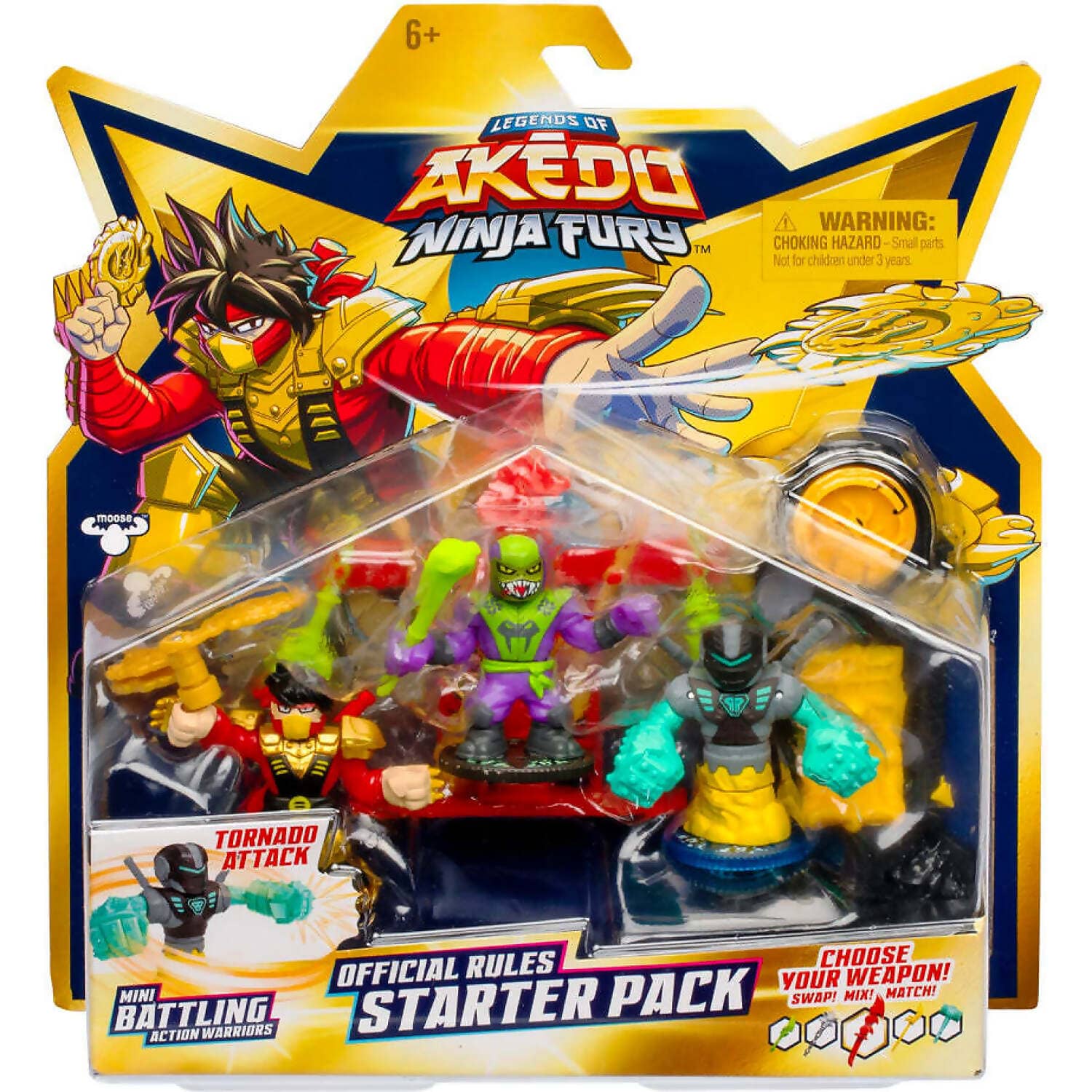 Be prepared for epic battles with the NEW Legends of Akedo Three Strike Chux Starter Pack! This pack provides kids with everything they need to train to become seasoned Akedo masters. Dive into a world where 3 intricately designed mini battling warriors: Ultra Rare Three Strikes Chux, the fierce Venom Fang Ninja, and the formidable Legendary Warrior Psyclone Shutdown are ready for epic combat. Each of these warriors has powerful weapons including: