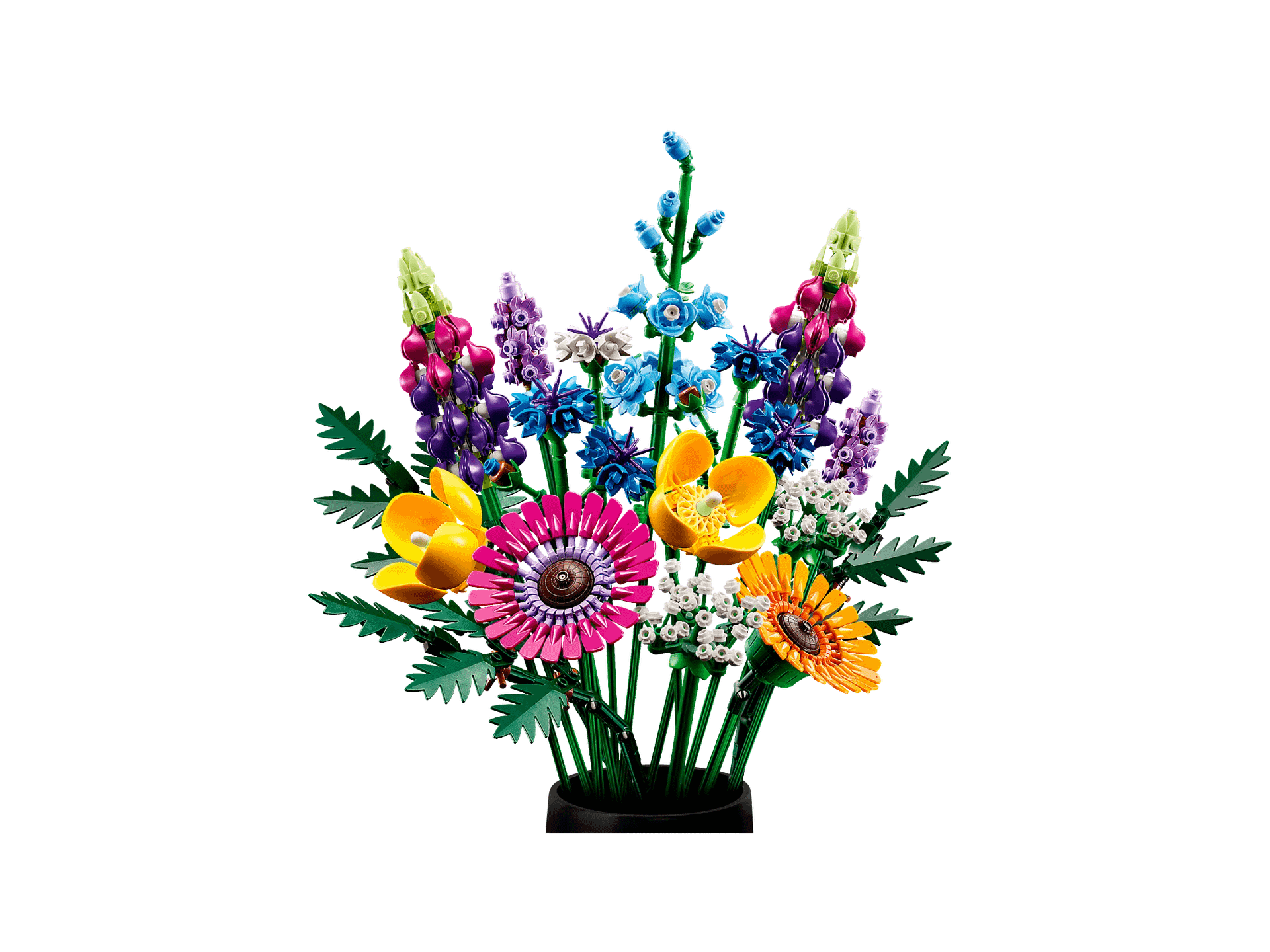 Giving and receiving flowers is always joyful, and this LEGO® Icons Wildflower Bouquet (10313) puts a creative spin on a timeless gift. Why not celebrate the next special occasion by sending a loved one flowers that will never wither or need to be watered?Let creativity bloomCrafted entirely from intricate LEGO pieces, the Wildflower Bouquet features 8 species of wildflowers on adjustable stems. Budding florists and flower lovers can spend hours building and identifying the blooms inspired by cornflowers, lavender, Welsh poppies, cow parsley, leatherleaf ferns, gerbera daisies, larkspur and lupins. Once complete, these LEGO flowers can be displayed in a favorite vase to become an eye-catching piece of home decor that will plant seeds of joy in whichever room they’re placed.Plants from plantsPart of the revolutionary LEGO Botanical Collection for adults, this set includes several elements made from a plant-based plastic produced using sustainably sourced sugarcane.