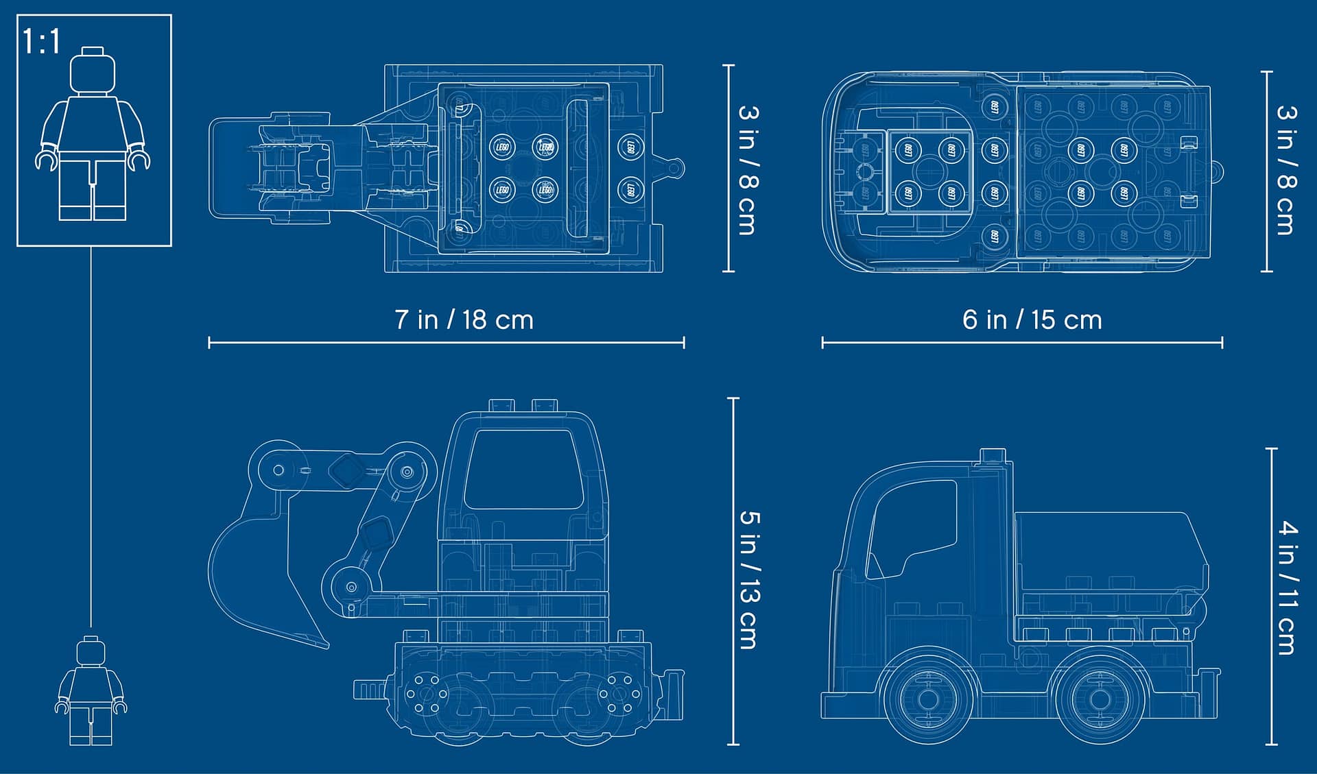 - The truck measures over 4'' (11cm) high, 5'' (14cm) long and 2'' (7cm) wide and the excavator measures over 4'' (12cm) high, 7'' (18cm) long and 2'' (7cm) wide – the perfect size for little hands to pick up and place.