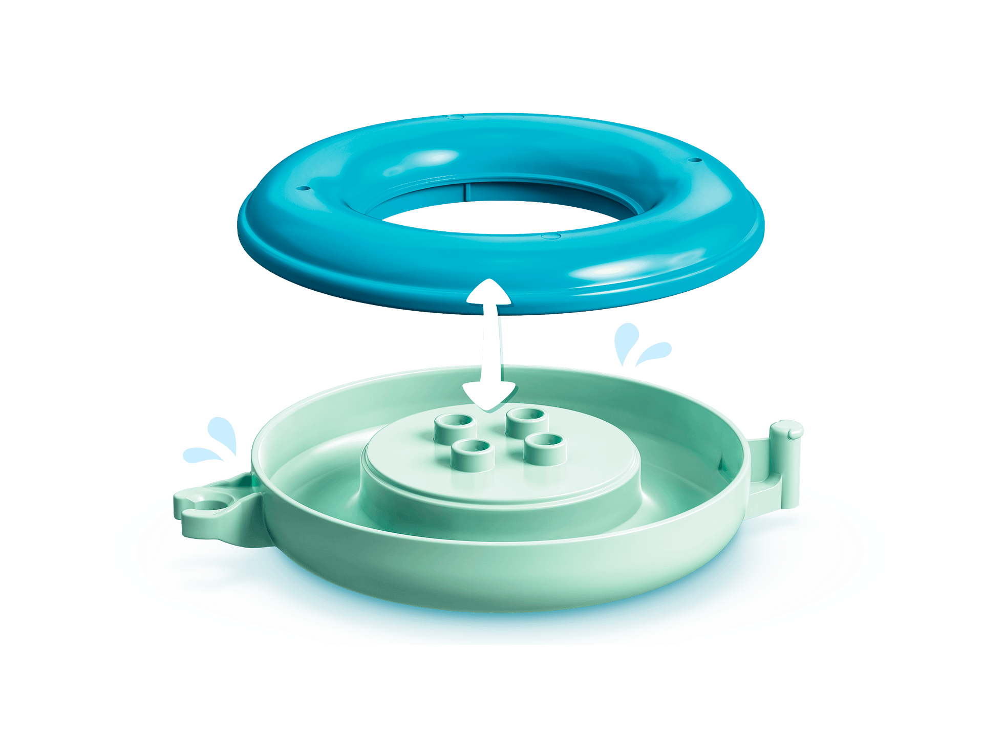 Turn your toddler’s bath time into a tropical island fun time, filled with developmental play possibilities! A friendly lion stands on his floating island paradise and a flamingo floats on a ring, while a fish and octopus splash in the water. There’s a bucket to for kids to wash the animals and a treegrowing on the island. The island splits into 2 separate floating sections, and it’s simple to keep hygienically clean – bath after bath. A rounded hook on the floating ring let kids connect with rings from Bath Time Fun: Floating Red Panda 10964 and Bath Time Fun: Floating Animal Train 10965 (sets sold separately).