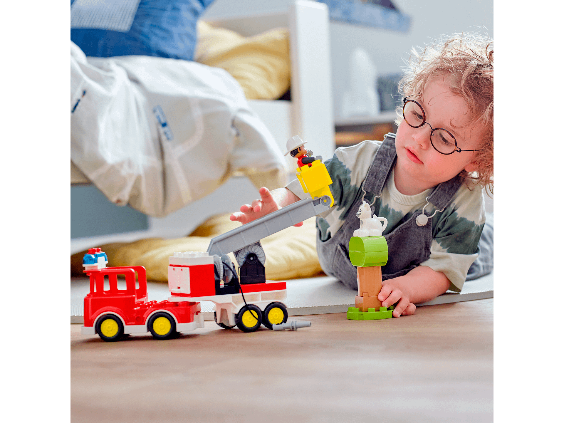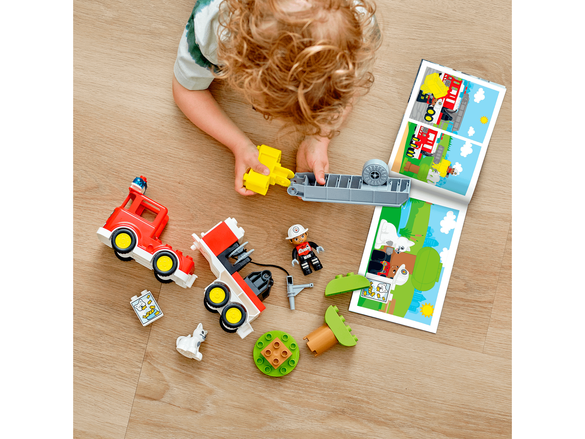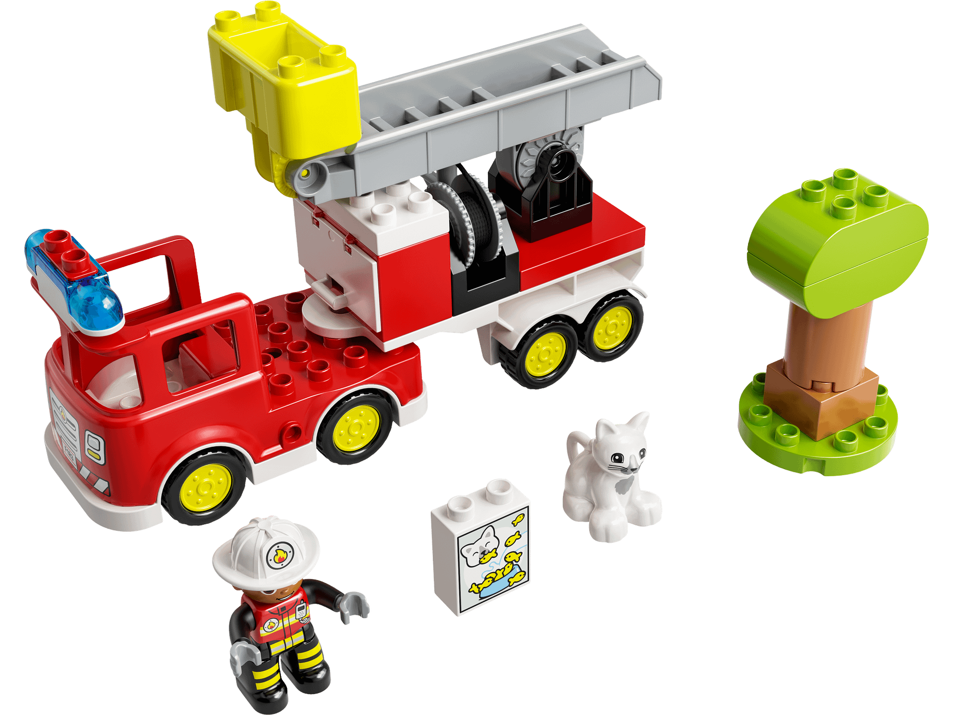 - Authentic details – The set includes a firefighter and a cat LEGO® DUPLO® figures, plus a buildable tree and a multi-function fire truck with flashing lights and siren ( Coin Cell batteries included)