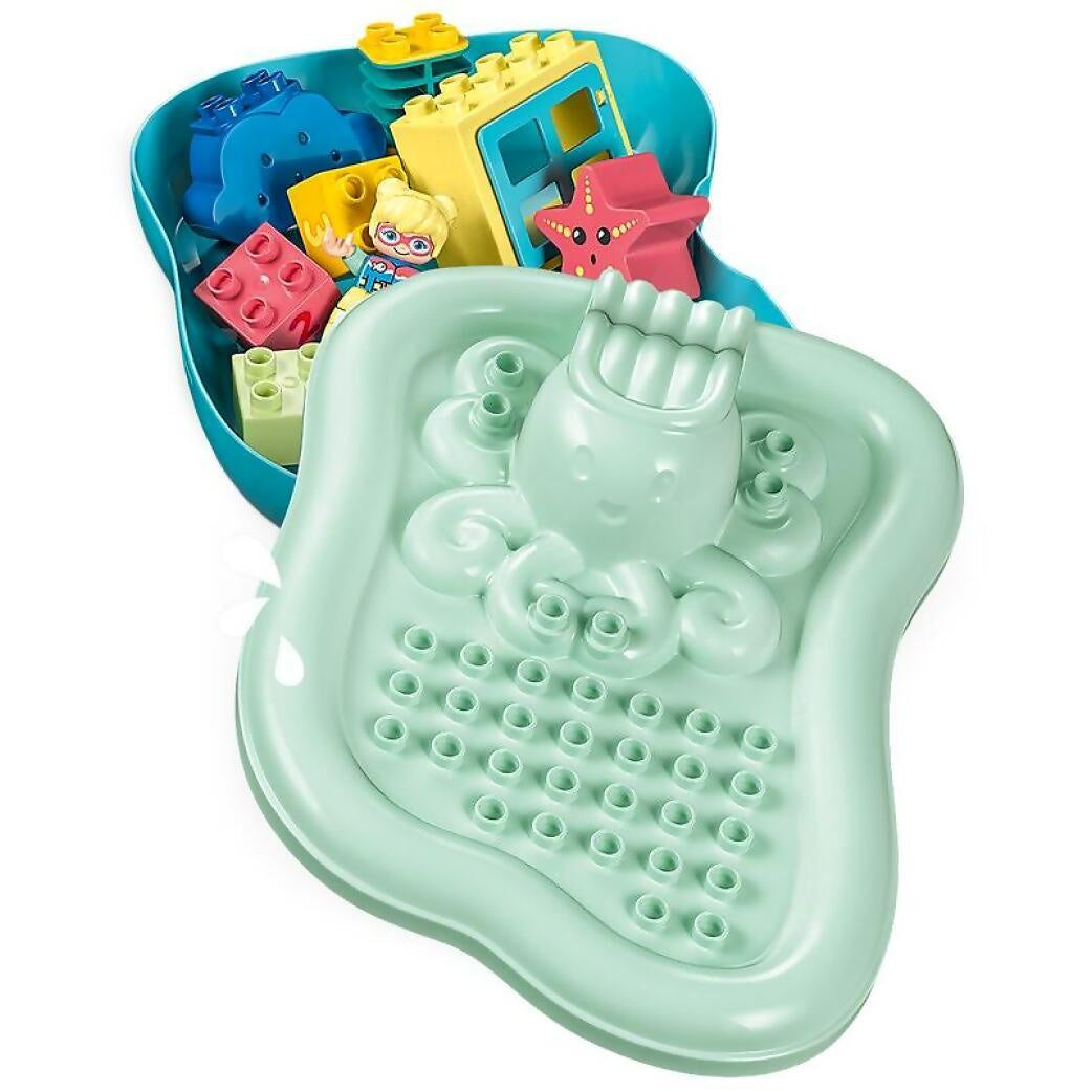 - Fun toy to build in the tub – This bath-time toy comes with a floating island and turtle ring, flexible palm tree and water bucket, octopus slide, 2 child figures, a sea star and rain-cloud pourers