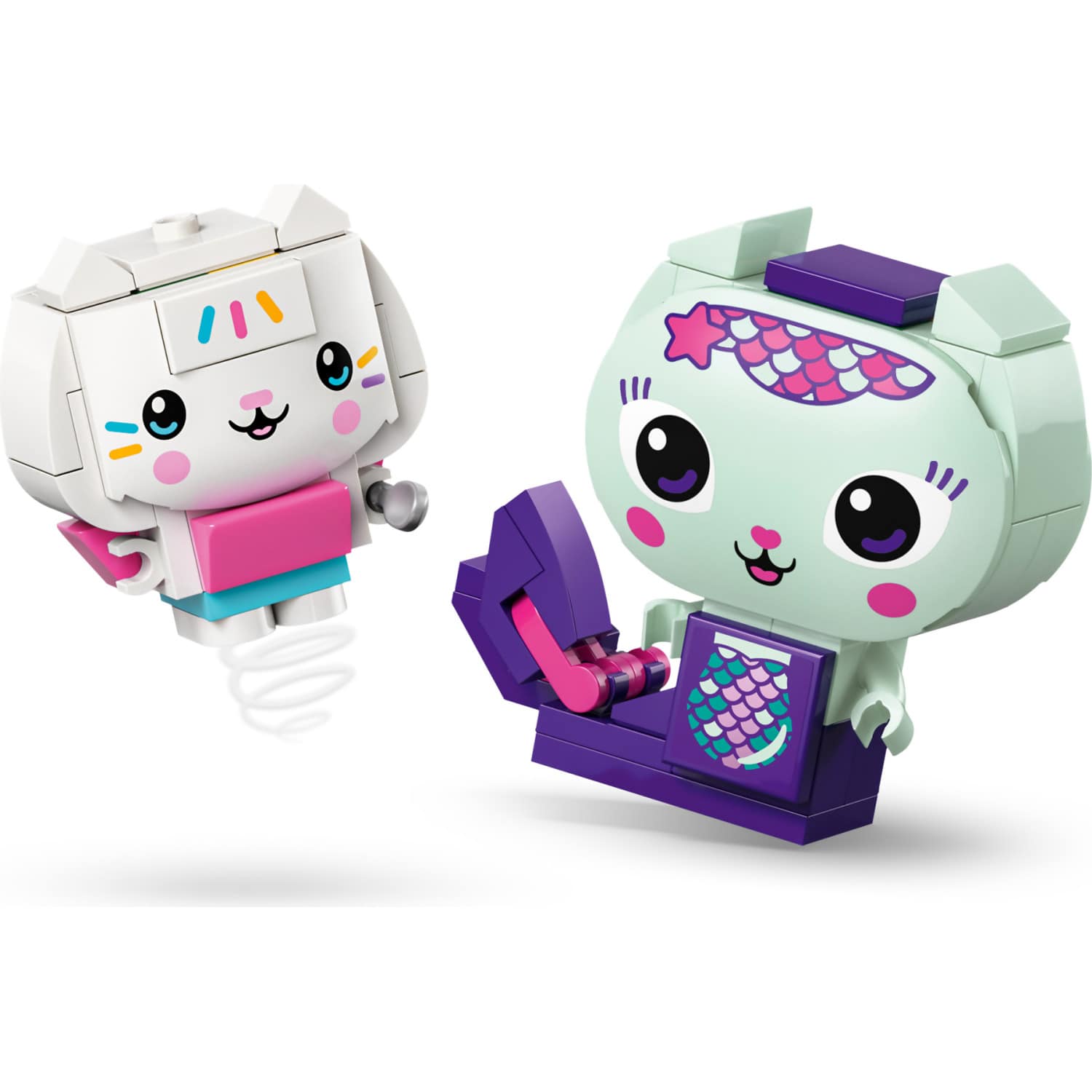 The set includes 6 figures to build, each with accessories from the TV show. MerCat has a diamond, Baby Box has a painting of Gabby, Kitty Fairy has a watering can, Pandy Paws has a dollhouse, Cakey has a cake and Daniel James ’DJ’ Catnip has a piano.