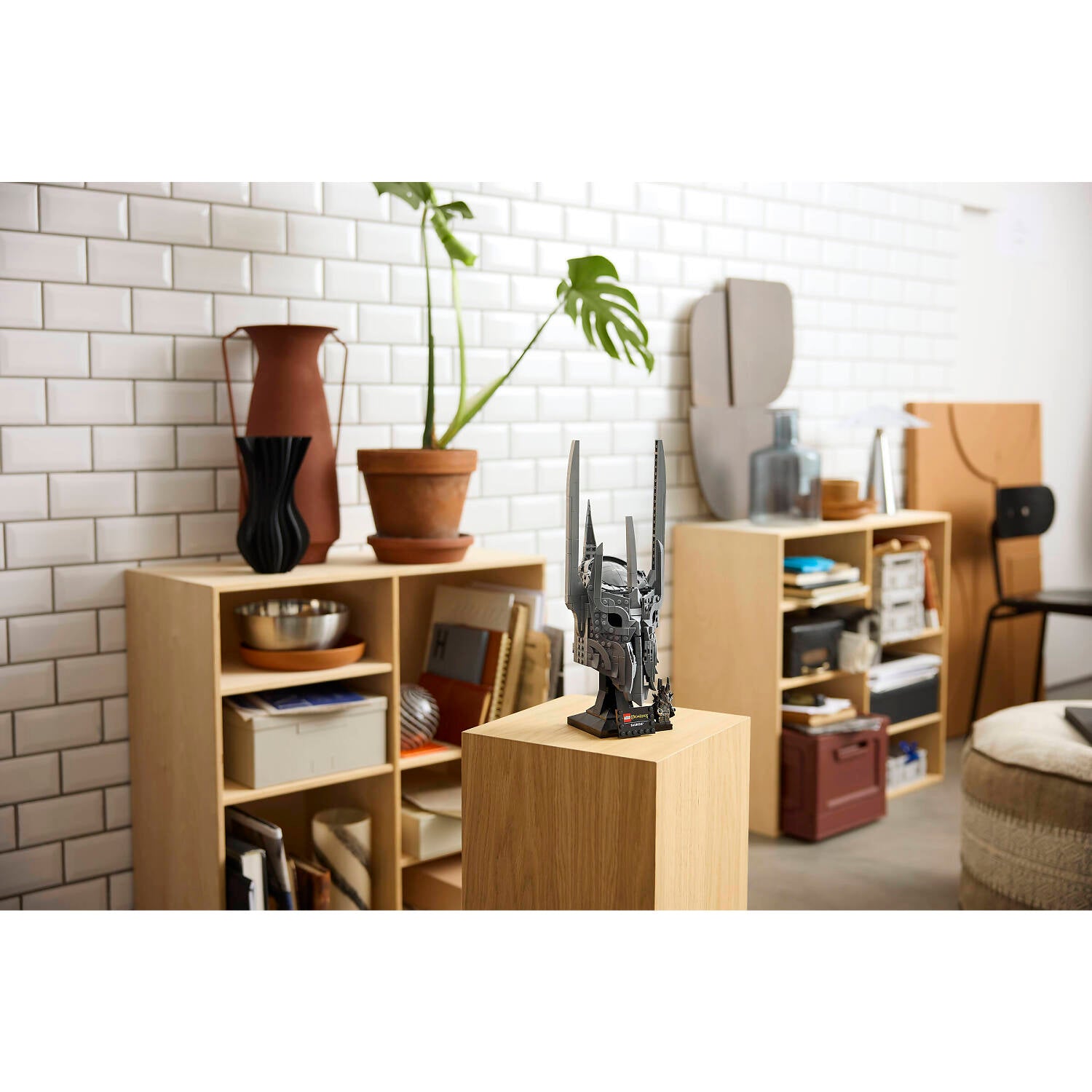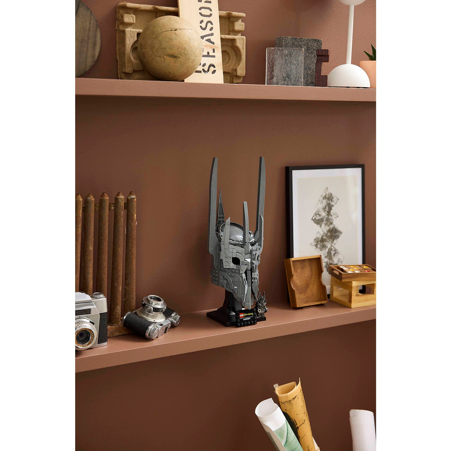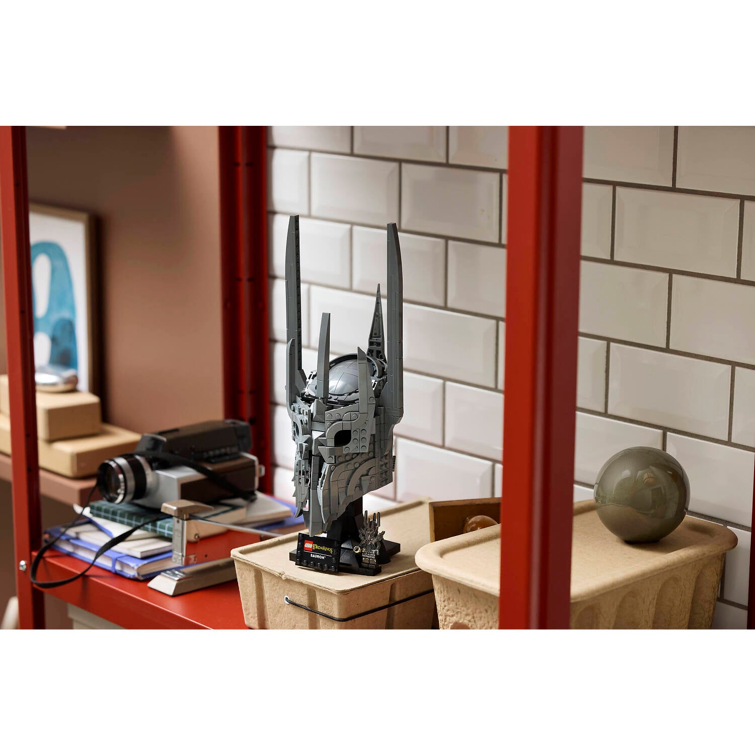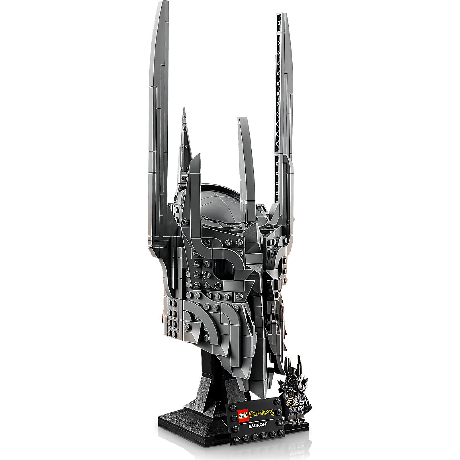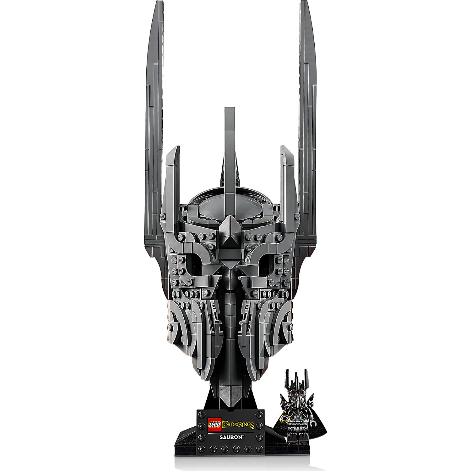 - WHAT’S IN THE BOX – Includes everything you need to craft a replica of Sauron’s helmet, plus a display stand and name plaque along with a Sauron™ minifigure holding The One Ring
