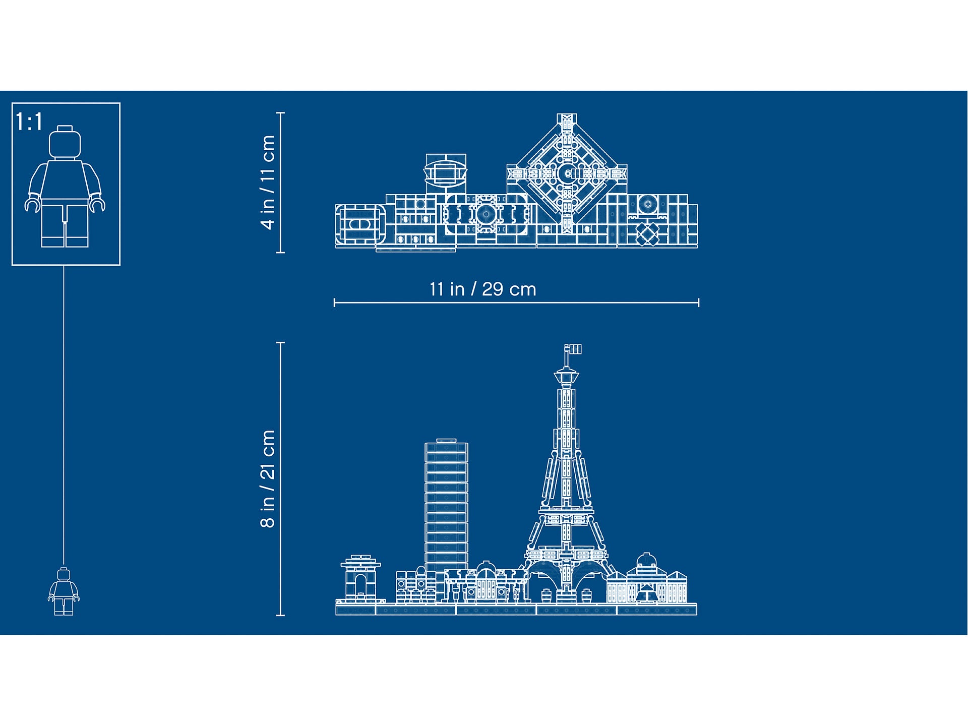 Bring together iconic Paris landmarks with this magnificent Paris skyline model. The 21044 LEGO Architecture Skyline Collection set features the Arc de Triomphe, Champs-Elysées, Tour Montparnasse, Grand Palais, Eiffel Tower and the Louvre, and is finished with grass and tree areas and a decorative Paris nameplate. This set has been designed to deliver a rewarding and relaxing building experience to all with an interest in architecture, travel, history and design, and makes a truly “mangnifique'' centerpiece for the home or office. Each skyline model is scaled to give an accurate representation of the comparative size of the featured structures, with realistic color depiction.