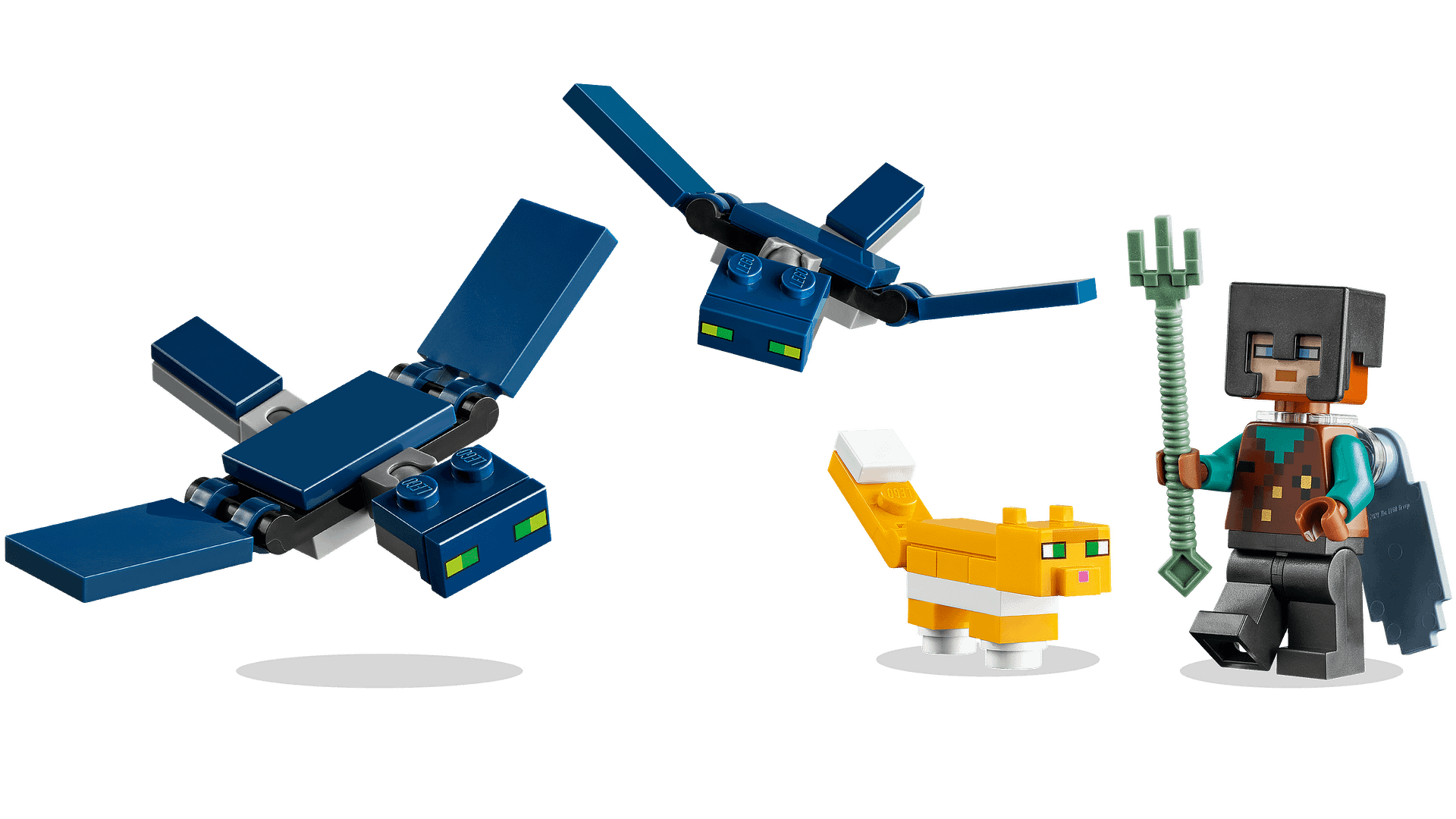 - Includes a Pilot figure with elytra wings, netherite helmet, firework rocket and trident; 2 flying phantoms; an orange tabby cat; and lots of authentic accessories.