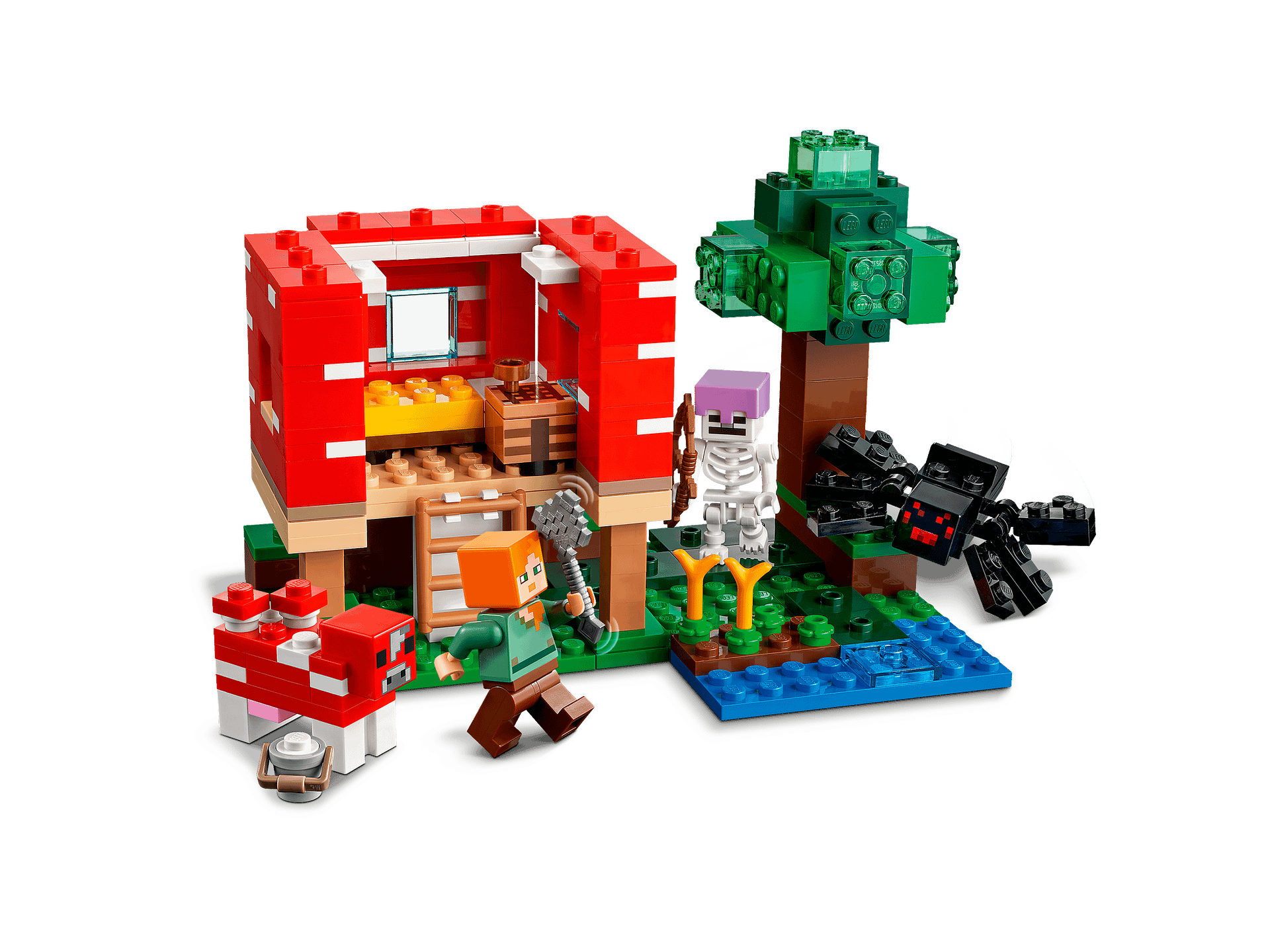 Minecraft players can get hands-on creative at the giant mushroom house. Its walls and roof lift off for easy access to the crafting table and furniture. Outside, Minecraft hero Alex uses a bowl to collect soup from the mooshroom cow. But plans change when a skeleton spider jockey rampages through the scene. The imaginative play possibilities are endless when kids enter the Minecraft mushroom house.